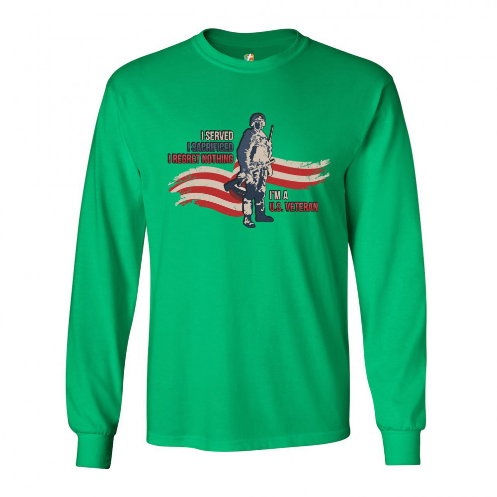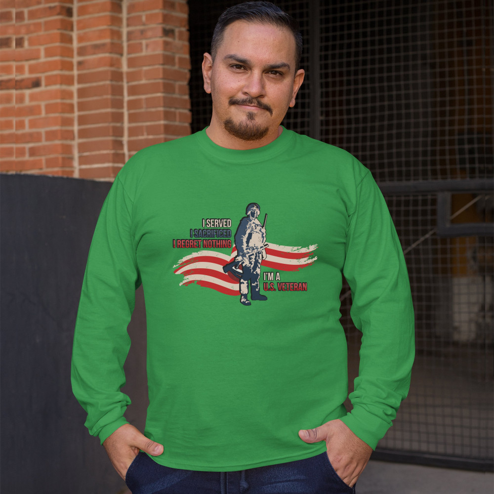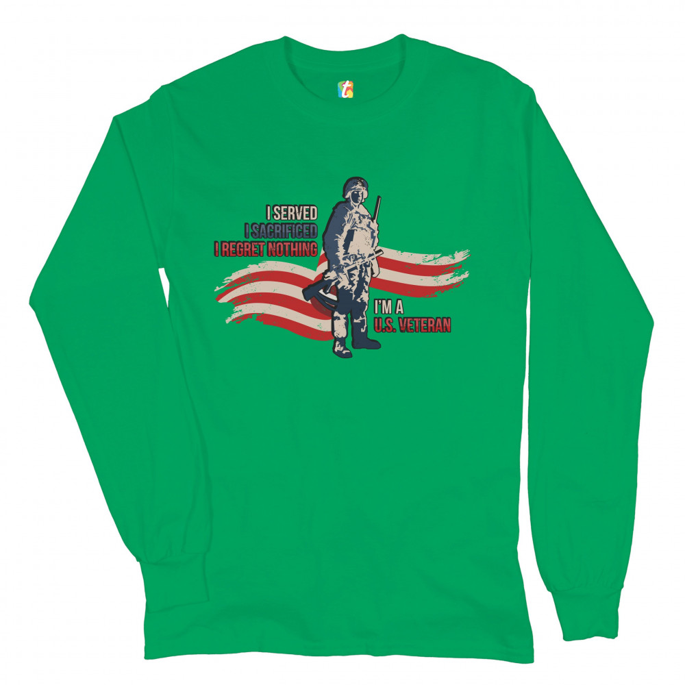 A patriotic print featuring a red-and-white stripe in the background and a soldier holding a rifle. The print says: "I Served I Sacrificed I Regreat Nothing I'm a U.S. Veteran". Great choice to wear on Independence Day or any other patriotic holiday.