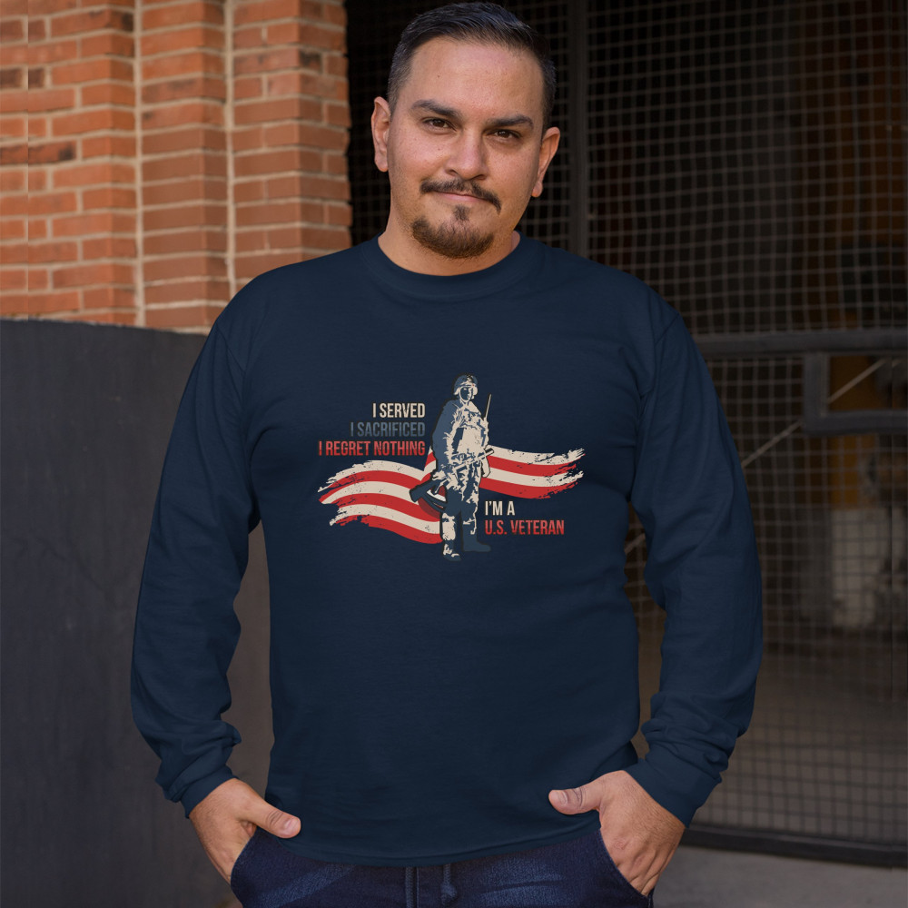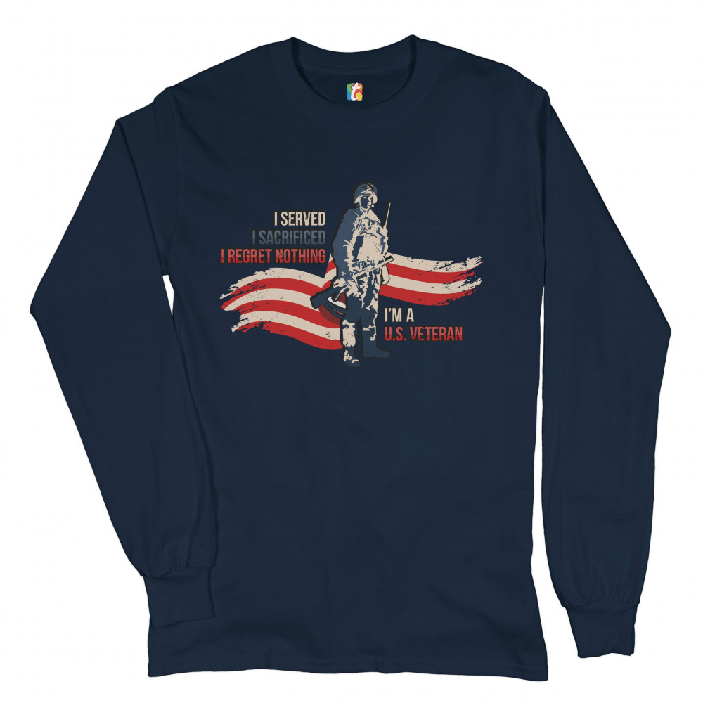 A patriotic print featuring a red-and-white stripe in the background and a soldier holding a rifle. The print says: "I Served I Sacrificed I Regreat Nothing I'm a U.S. Veteran". Great choice to wear on Independence Day or any other patriotic holiday.