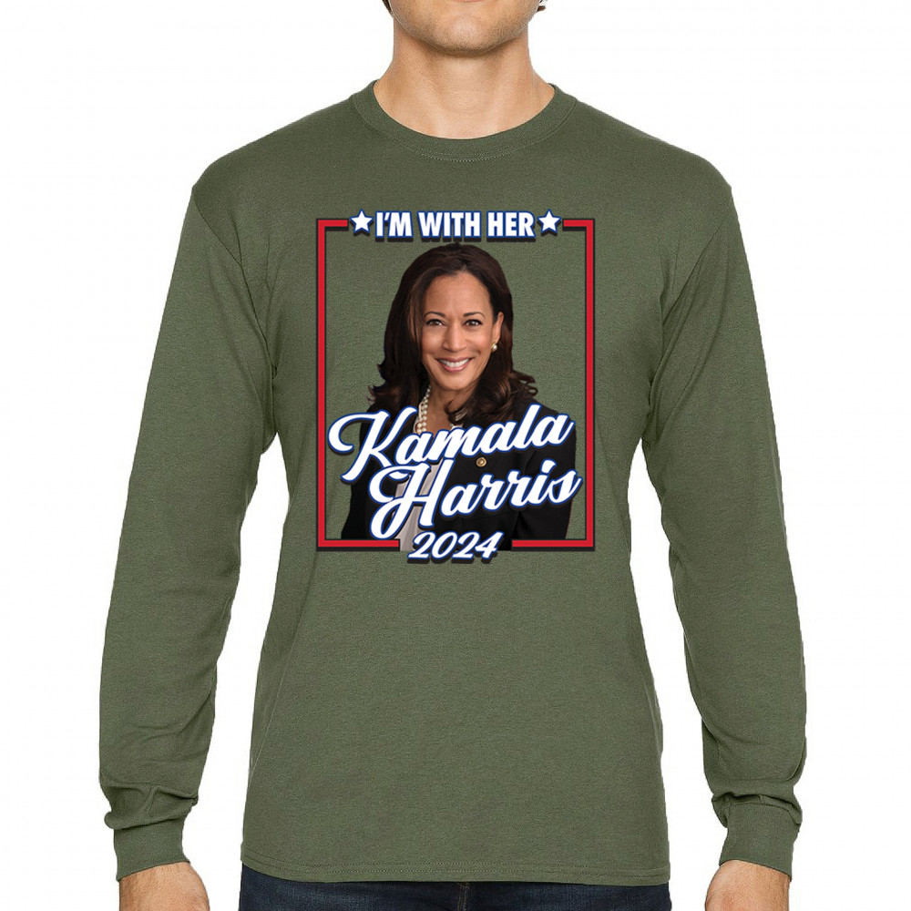 Stand with Kamala Harris in her 2024 presidential campaign with this vibrant design. Highlighting her commitment to progressive causes, this design is perfect for supporters of LGBTQ+ rights, women's rights, and social justice. Featuring the iconic "I'm With Her" slogan, it's a bold statement for anyone who believes in a brighter future. Wear it to rallies, events, or any day to show your support for Kamala Harris and her vision for America. A great addition to any supporter’s collection!