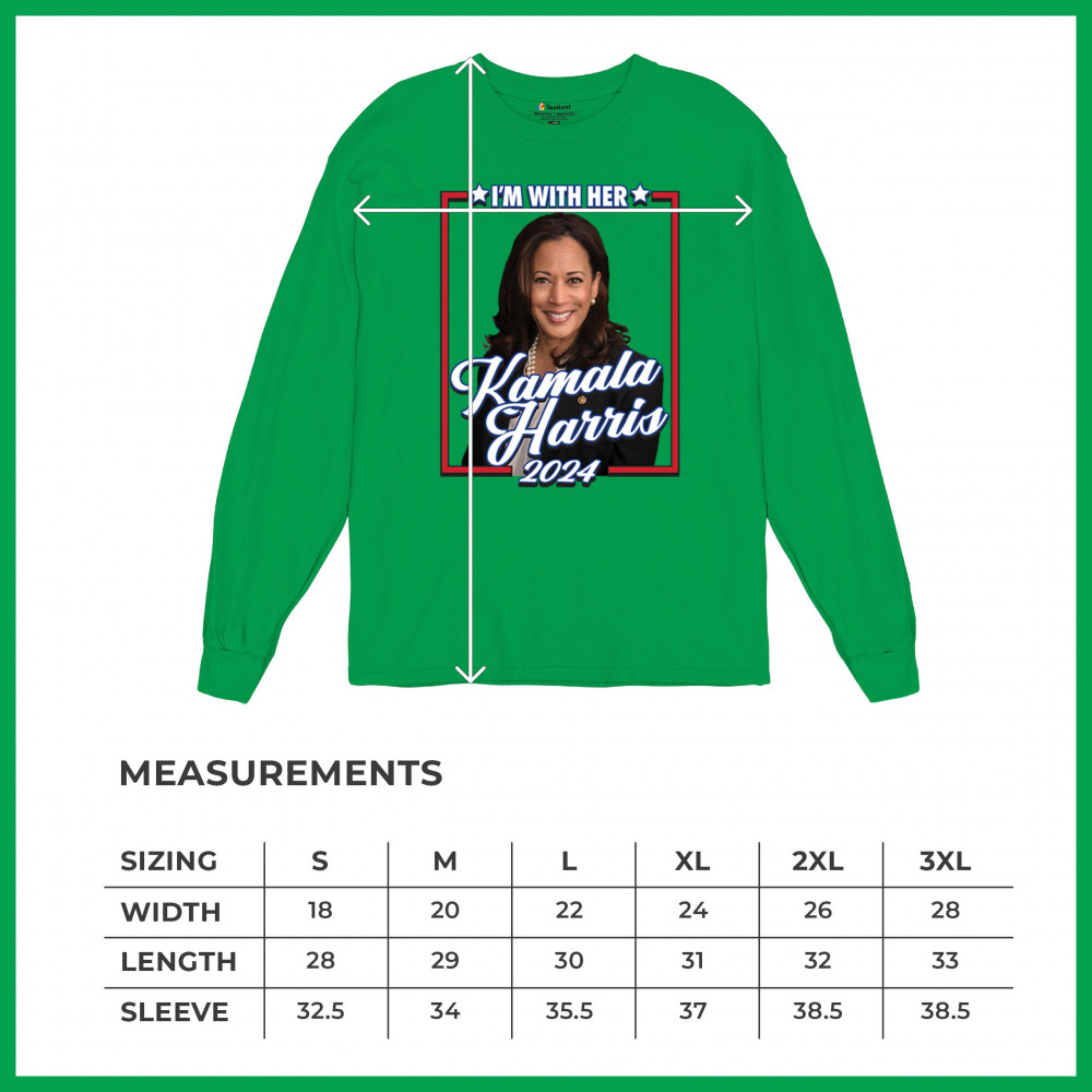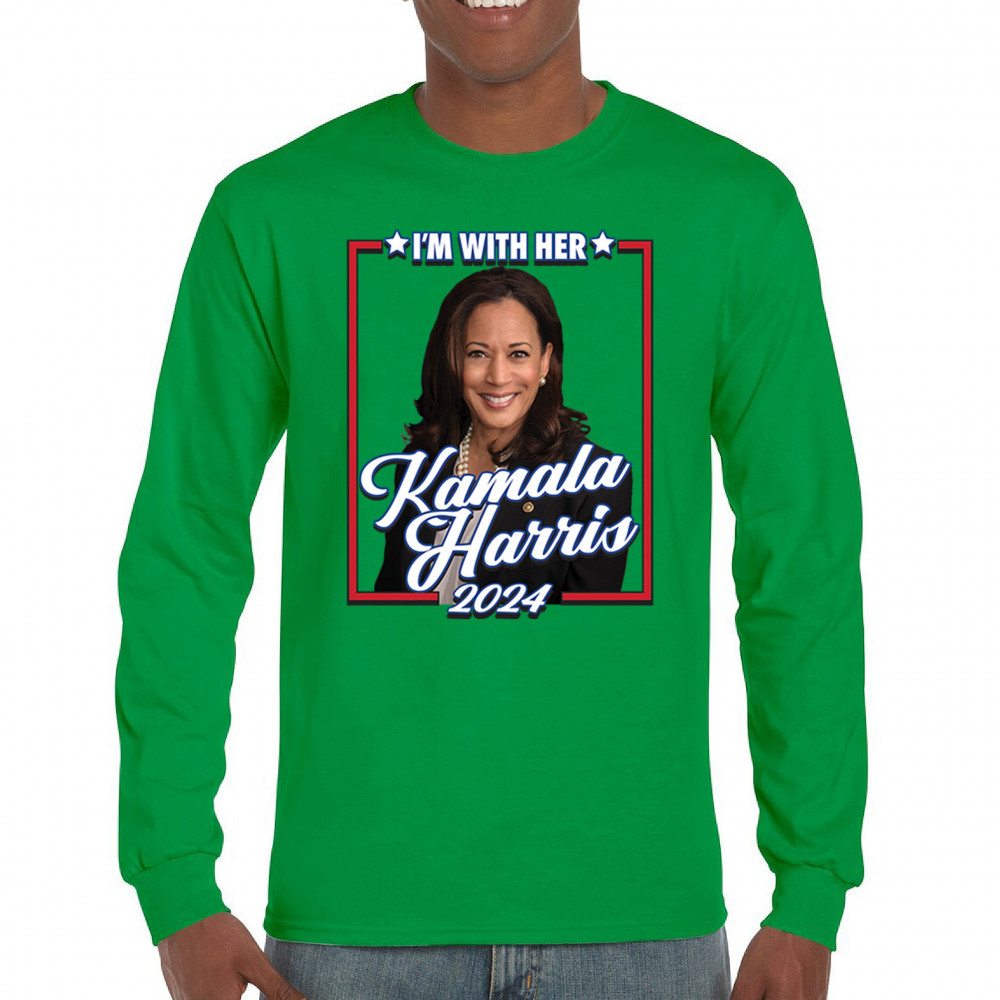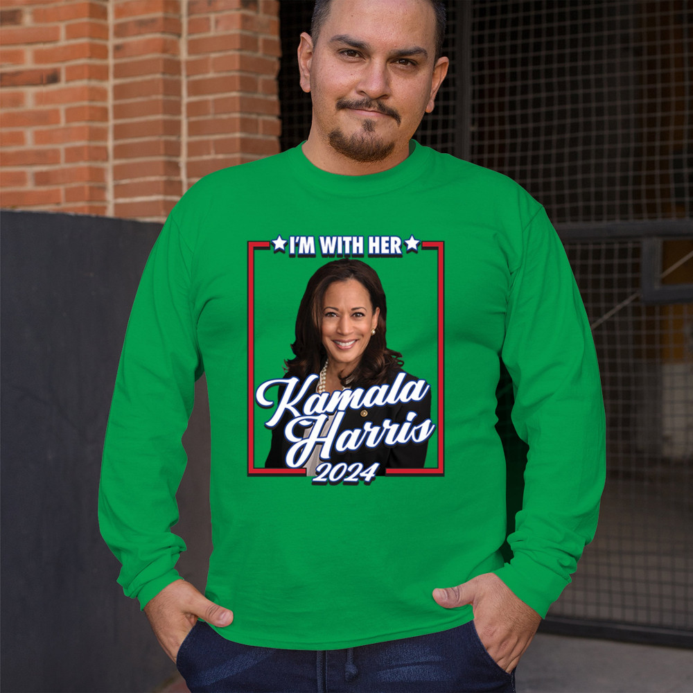 Stand with Kamala Harris in her 2024 presidential campaign with this vibrant design. Highlighting her commitment to progressive causes, this design is perfect for supporters of LGBTQ+ rights, women's rights, and social justice. Featuring the iconic "I'm With Her" slogan, it's a bold statement for anyone who believes in a brighter future. Wear it to rallies, events, or any day to show your support for Kamala Harris and her vision for America. A great addition to any supporter’s collection!