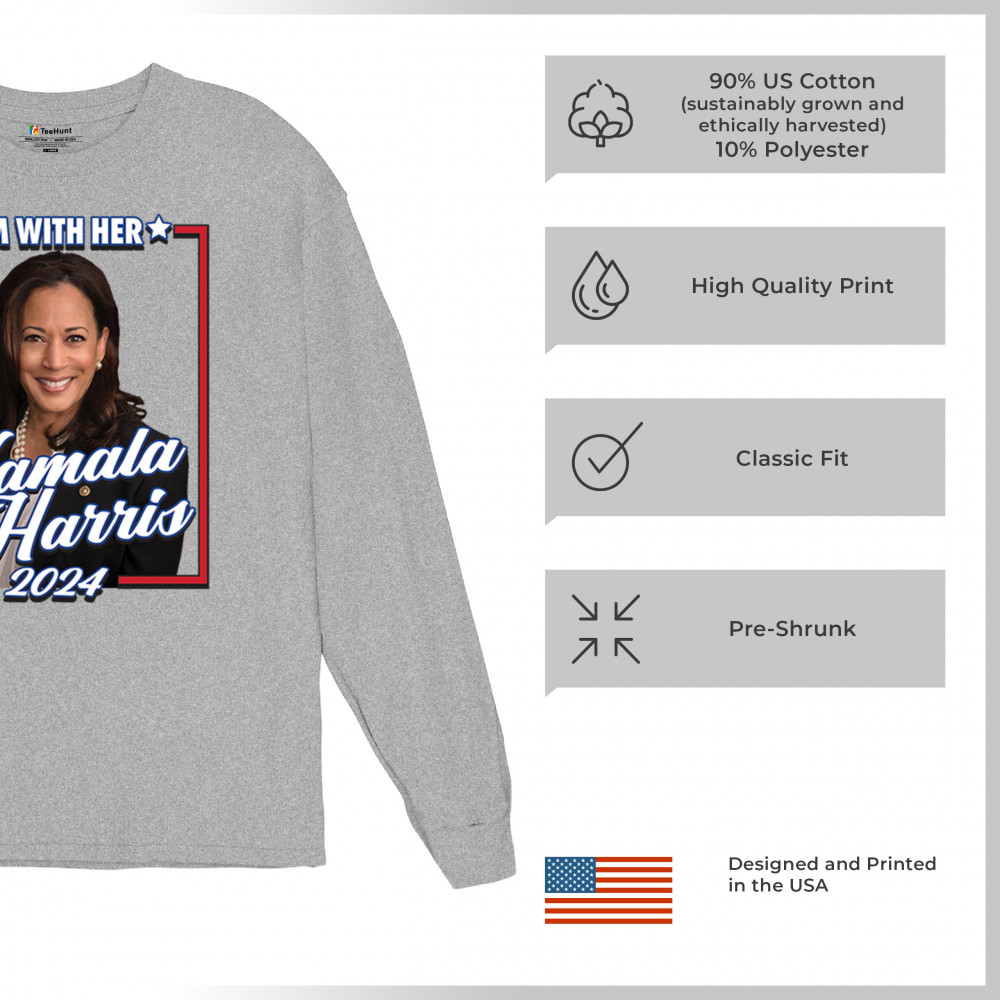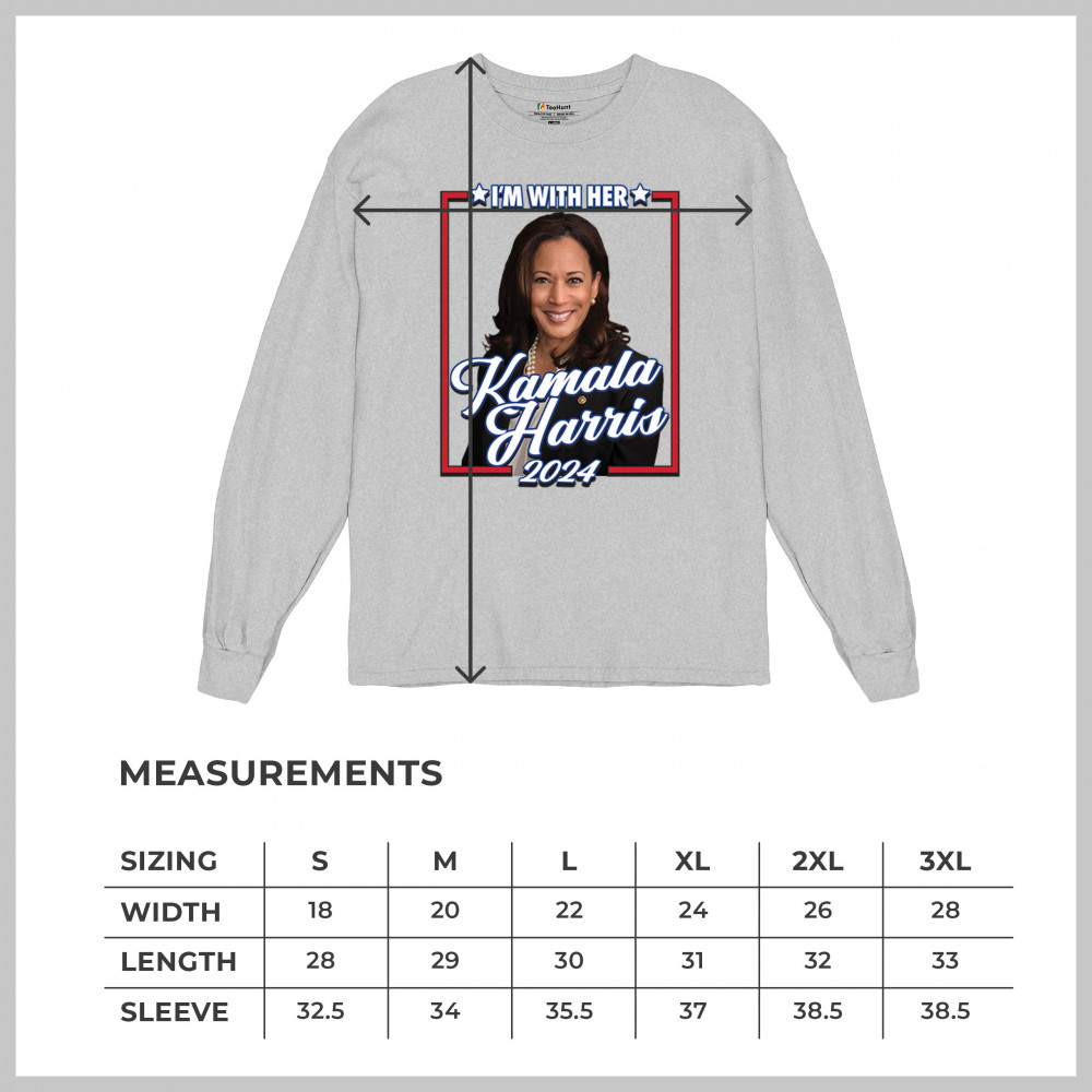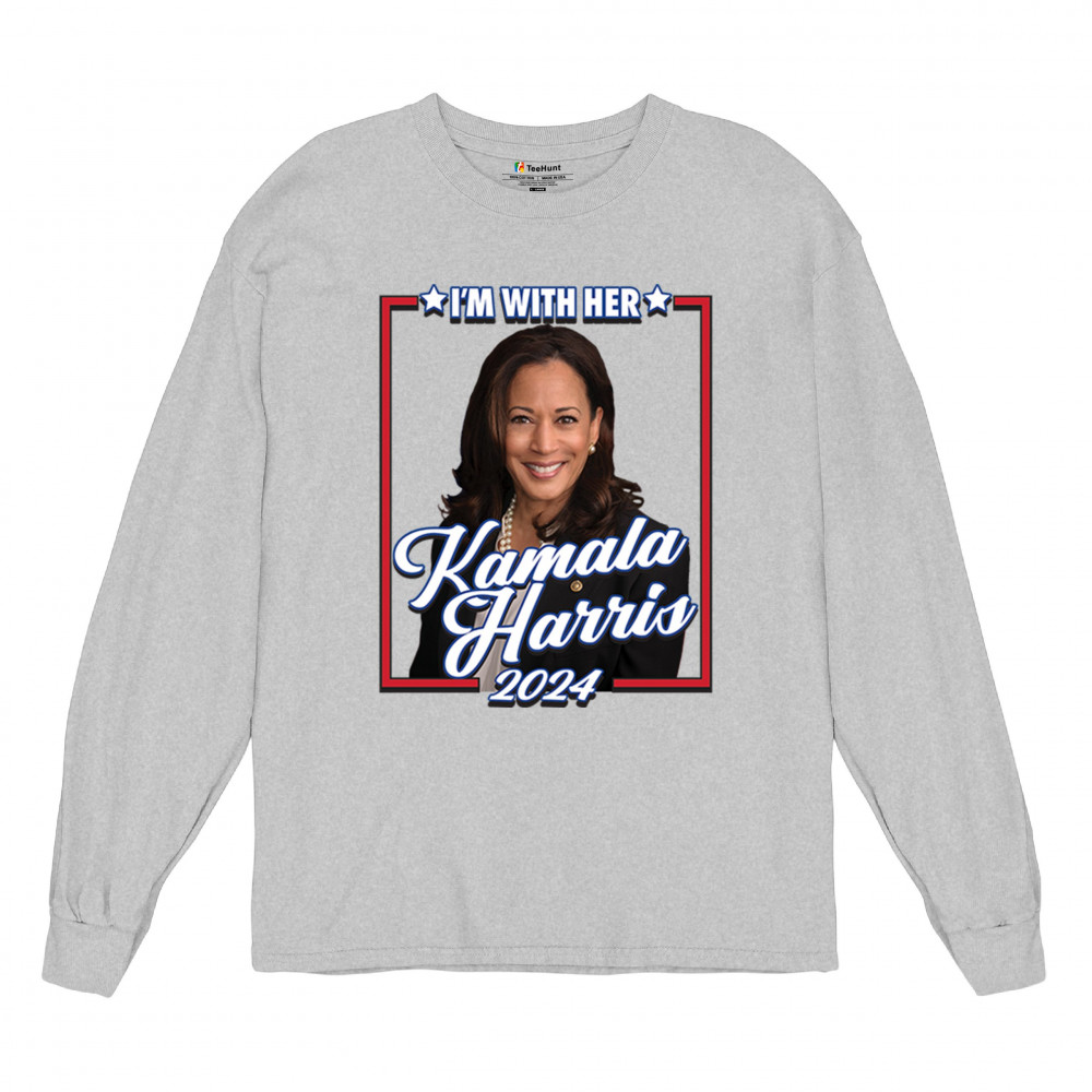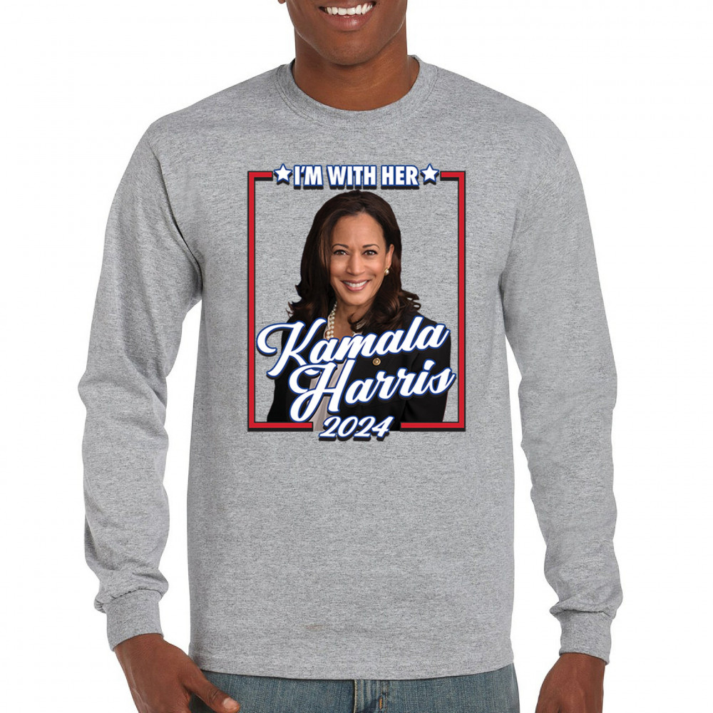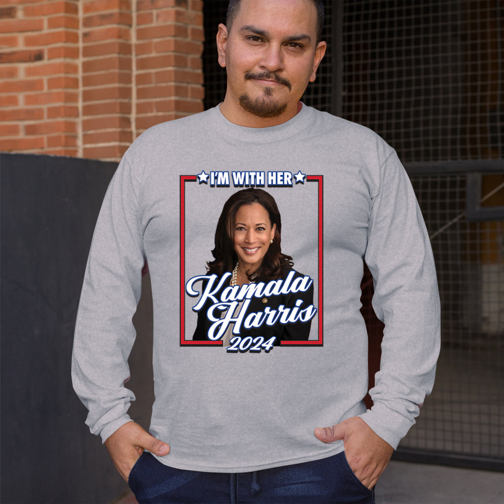 Stand with Kamala Harris in her 2024 presidential campaign with this vibrant design. Highlighting her commitment to progressive causes, this design is perfect for supporters of LGBTQ+ rights, women's rights, and social justice. Featuring the iconic "I'm With Her" slogan, it's a bold statement for anyone who believes in a brighter future. Wear it to rallies, events, or any day to show your support for Kamala Harris and her vision for America. A great addition to any supporter’s collection!