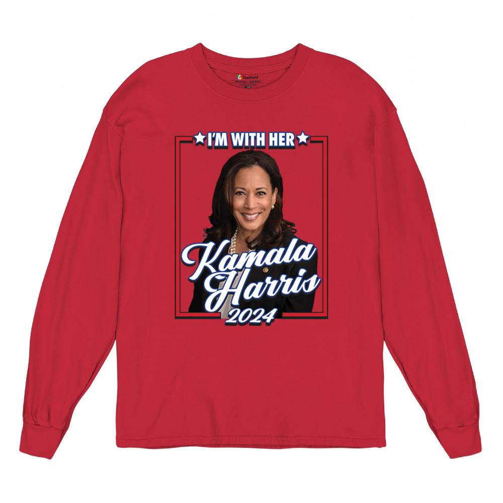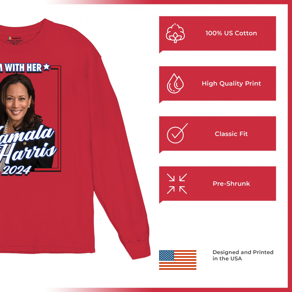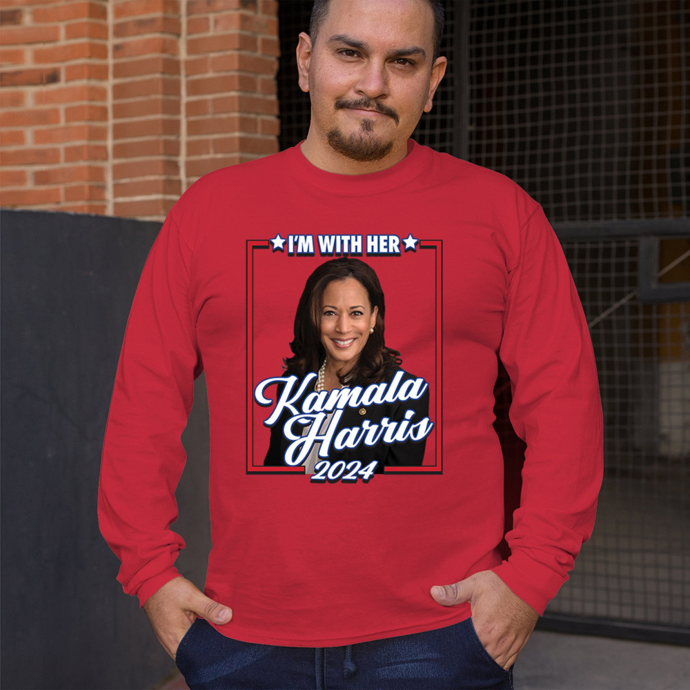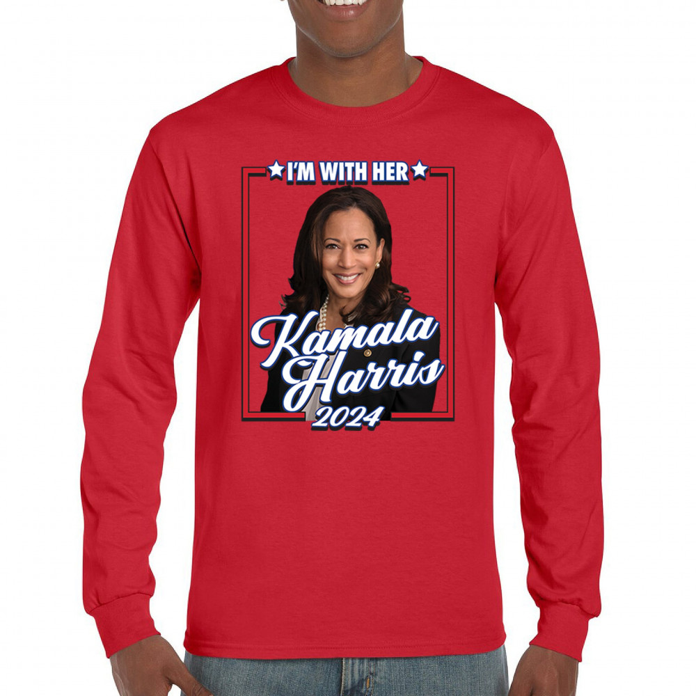 Stand with Kamala Harris in her 2024 presidential campaign with this vibrant design. Highlighting her commitment to progressive causes, this design is perfect for supporters of LGBTQ+ rights, women's rights, and social justice. Featuring the iconic "I'm With Her" slogan, it's a bold statement for anyone who believes in a brighter future. Wear it to rallies, events, or any day to show your support for Kamala Harris and her vision for America. A great addition to any supporter’s collection!