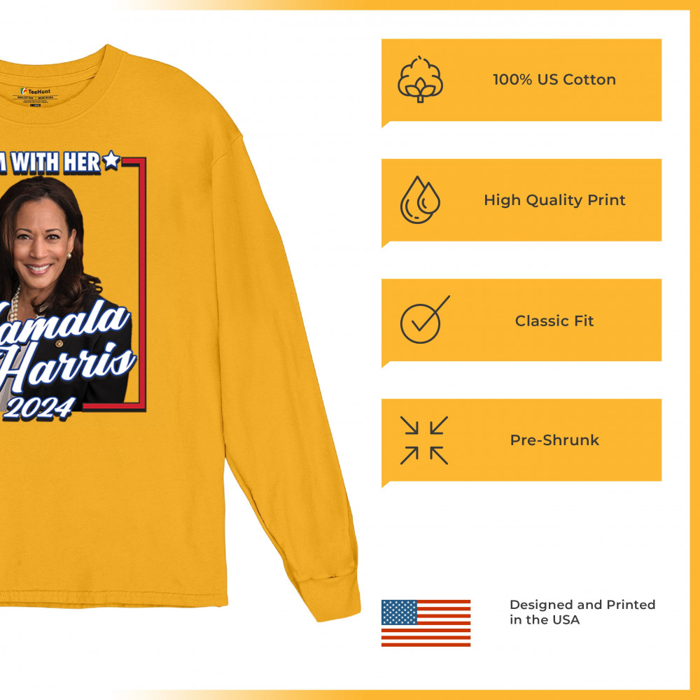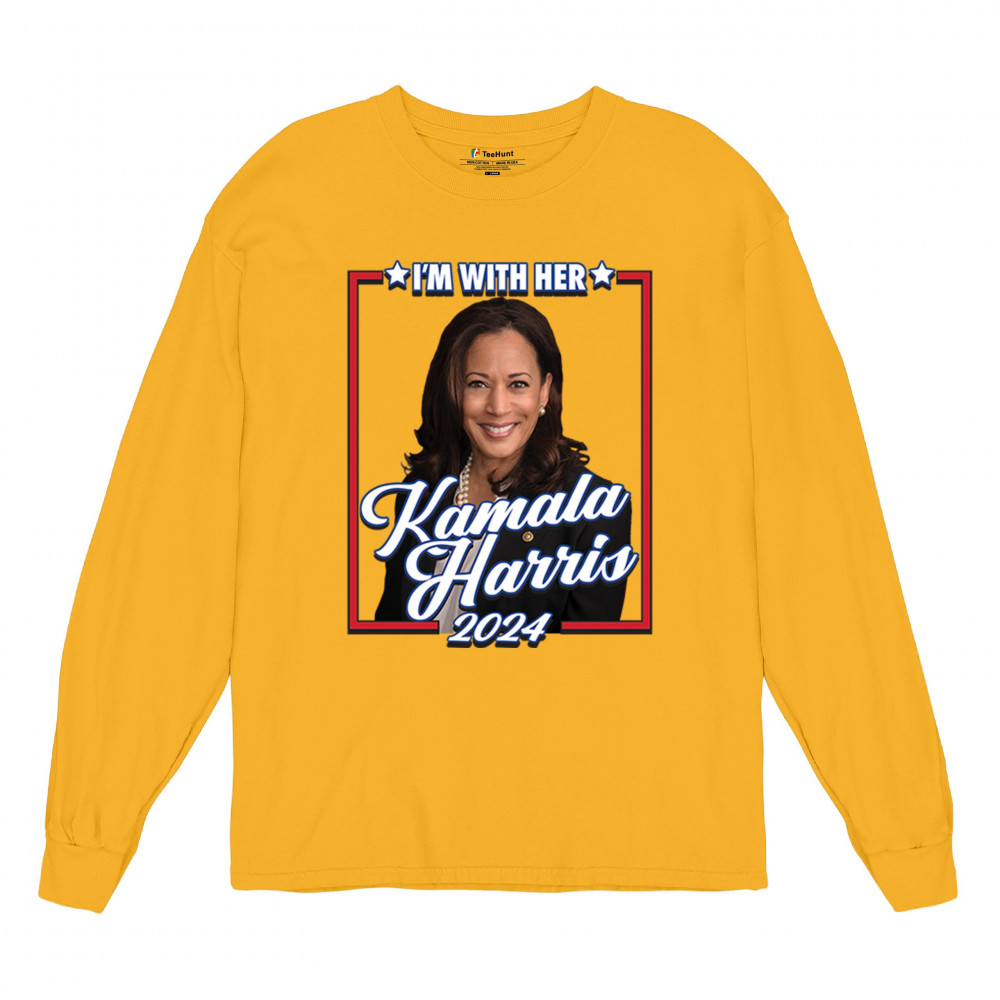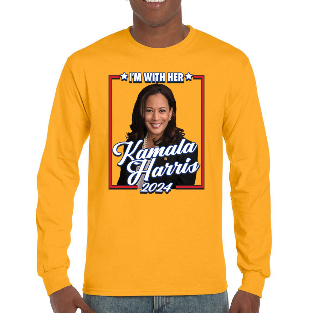 Stand with Kamala Harris in her 2024 presidential campaign with this vibrant design. Highlighting her commitment to progressive causes, this design is perfect for supporters of LGBTQ+ rights, women's rights, and social justice. Featuring the iconic "I'm With Her" slogan, it's a bold statement for anyone who believes in a brighter future. Wear it to rallies, events, or any day to show your support for Kamala Harris and her vision for America. A great addition to any supporter’s collection!