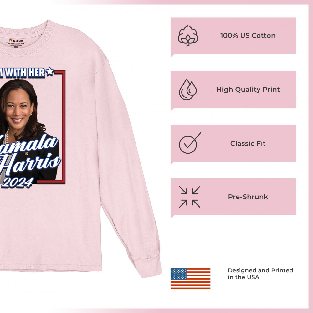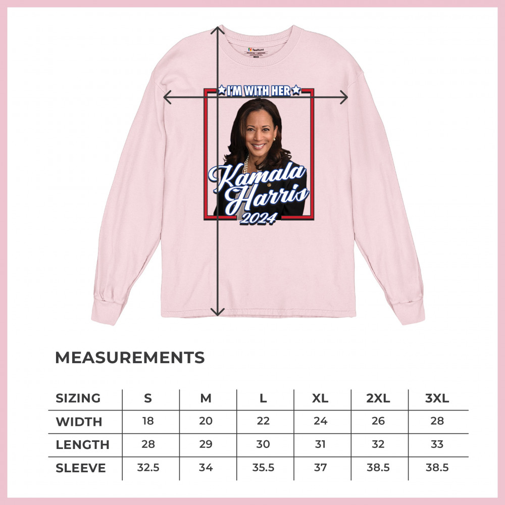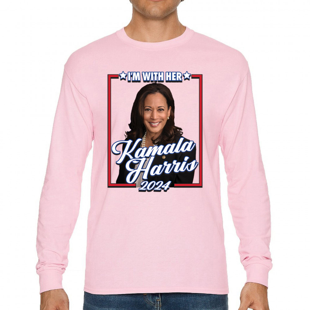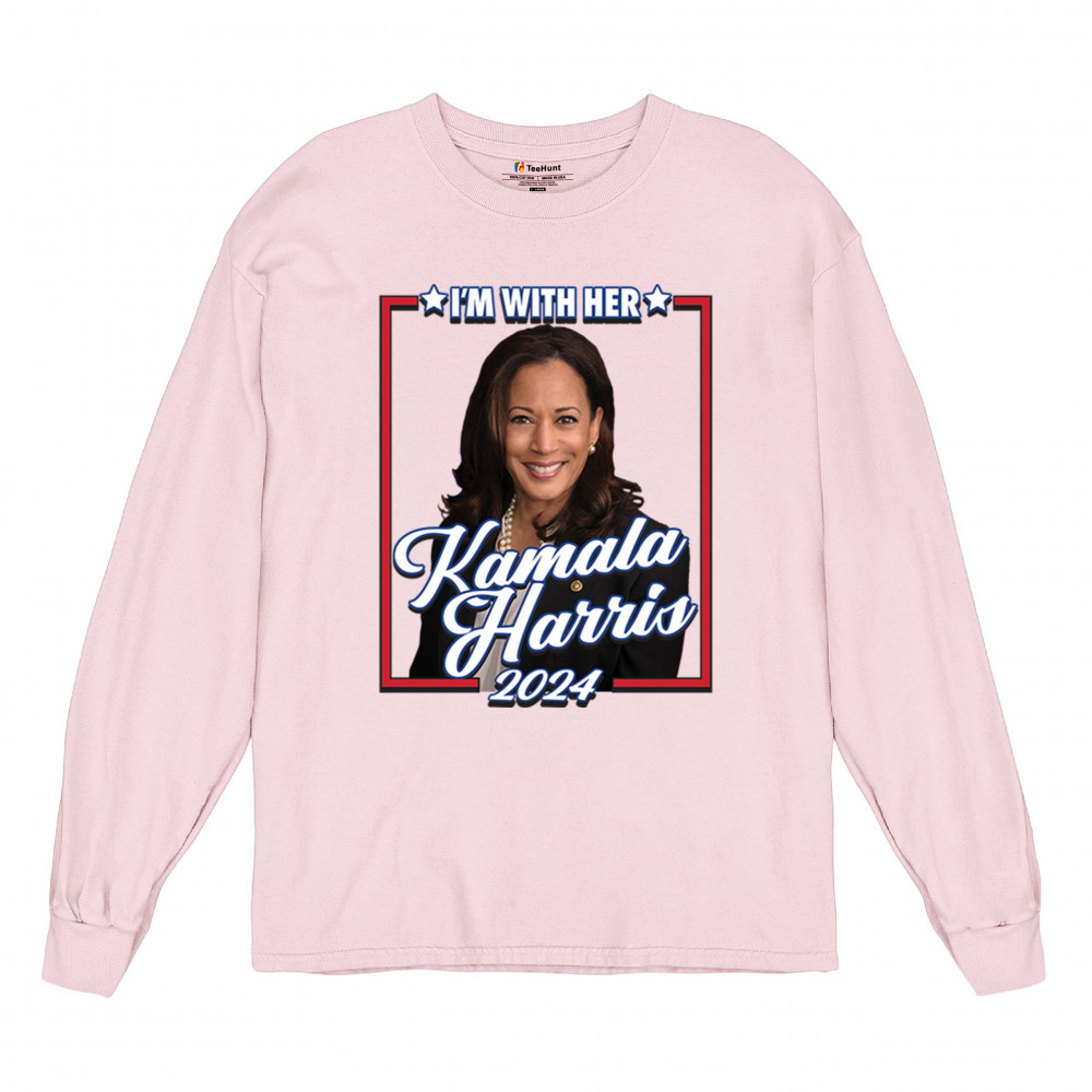 Stand with Kamala Harris in her 2024 presidential campaign with this vibrant design. Highlighting her commitment to progressive causes, this design is perfect for supporters of LGBTQ+ rights, women's rights, and social justice. Featuring the iconic "I'm With Her" slogan, it's a bold statement for anyone who believes in a brighter future. Wear it to rallies, events, or any day to show your support for Kamala Harris and her vision for America. A great addition to any supporter’s collection!