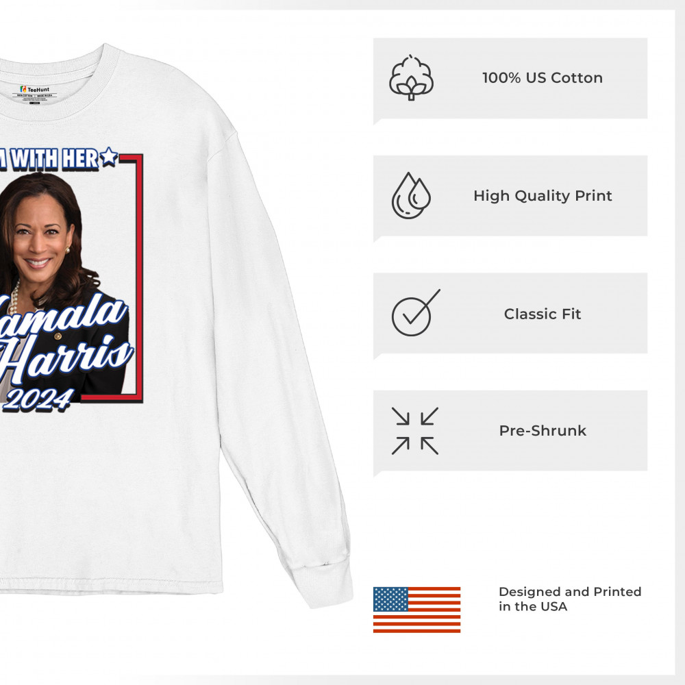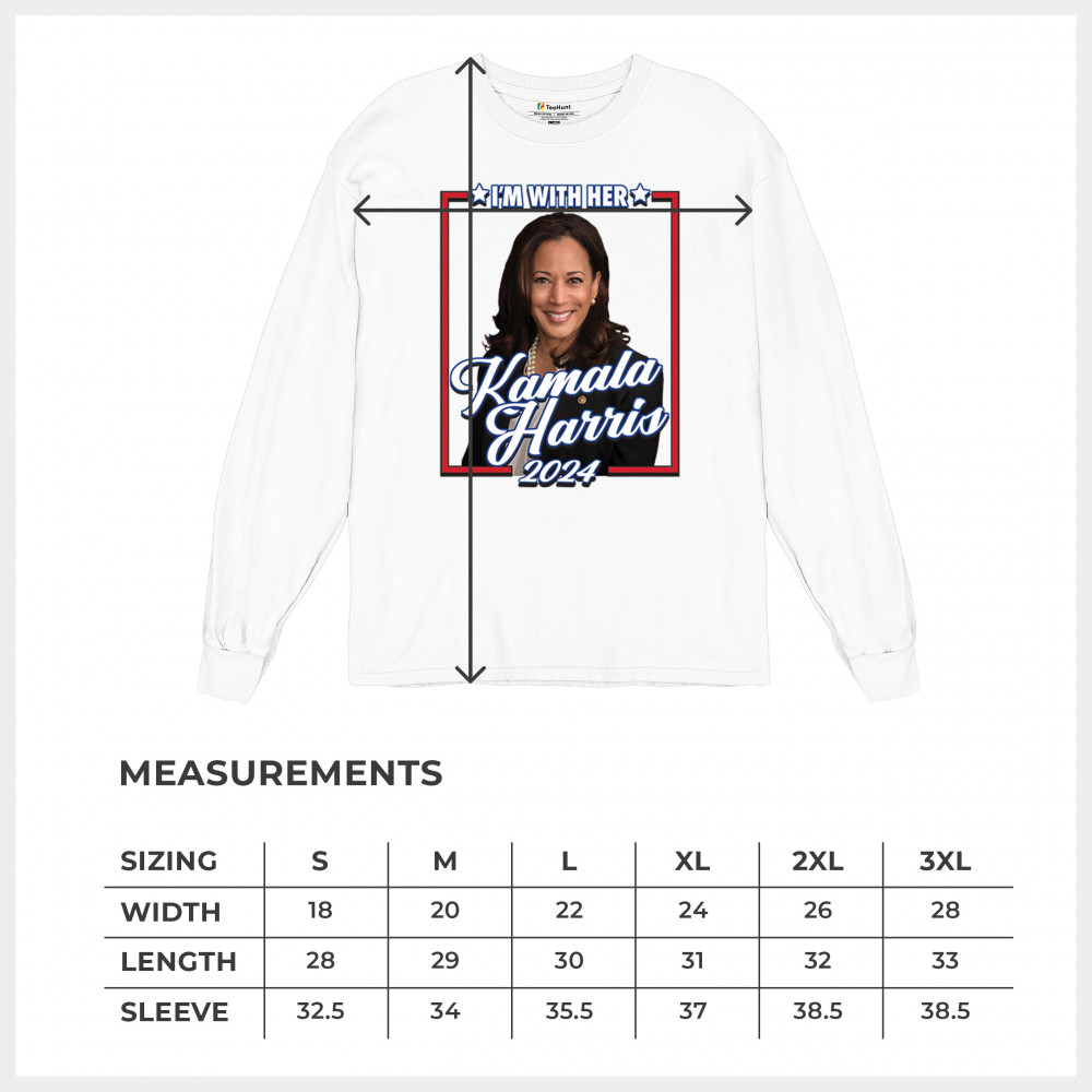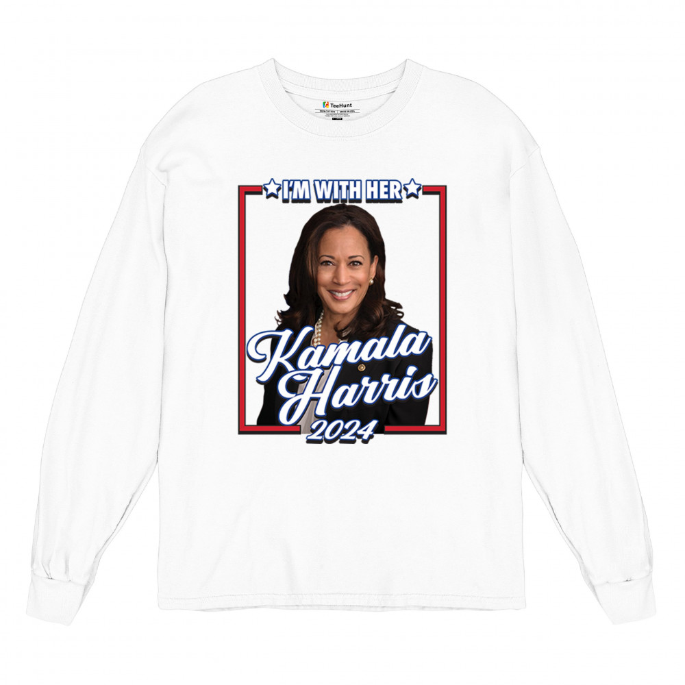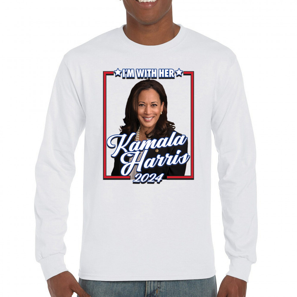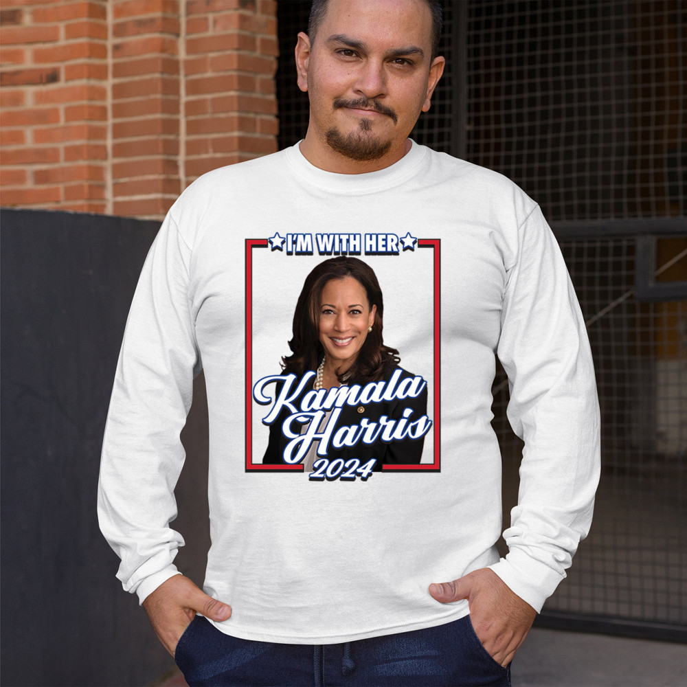 Stand with Kamala Harris in her 2024 presidential campaign with this vibrant design. Highlighting her commitment to progressive causes, this design is perfect for supporters of LGBTQ+ rights, women's rights, and social justice. Featuring the iconic "I'm With Her" slogan, it's a bold statement for anyone who believes in a brighter future. Wear it to rallies, events, or any day to show your support for Kamala Harris and her vision for America. A great addition to any supporter’s collection!