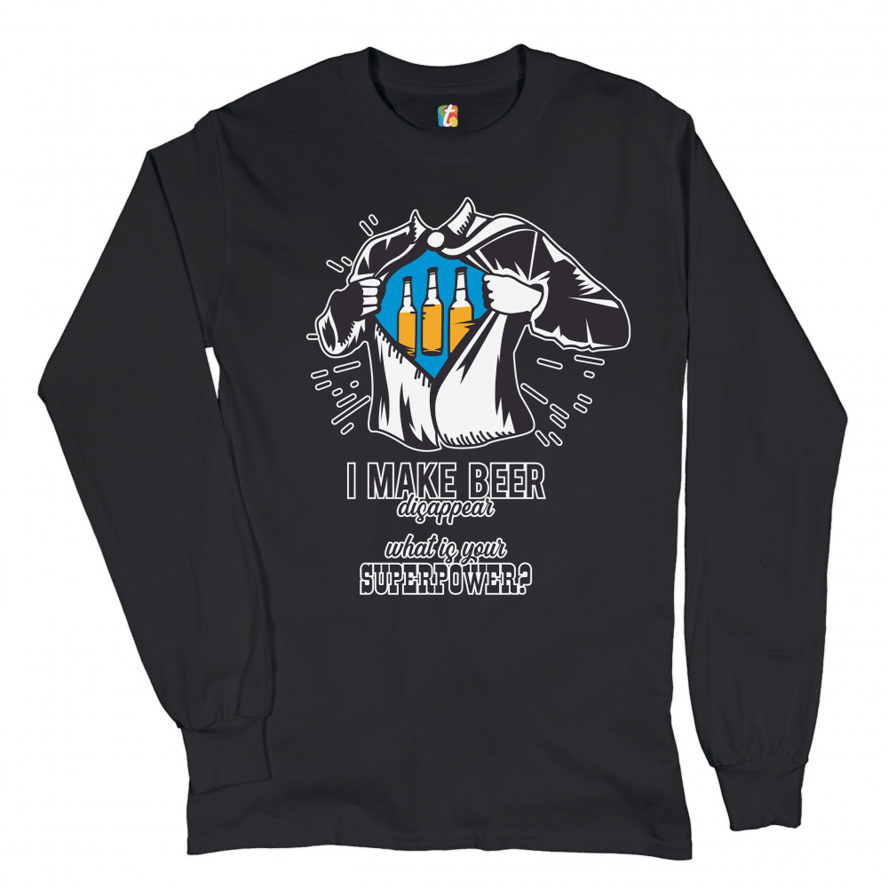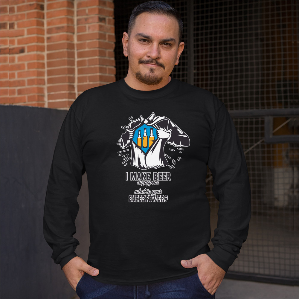 A funny print featuring a torso of man, who is ripping his shirt, exposing a picture of three bottles of beer. Underneath the picture the print says: "I make beer disappear. What is your superpower?". Great choice as a gift for Father's Day celebration.