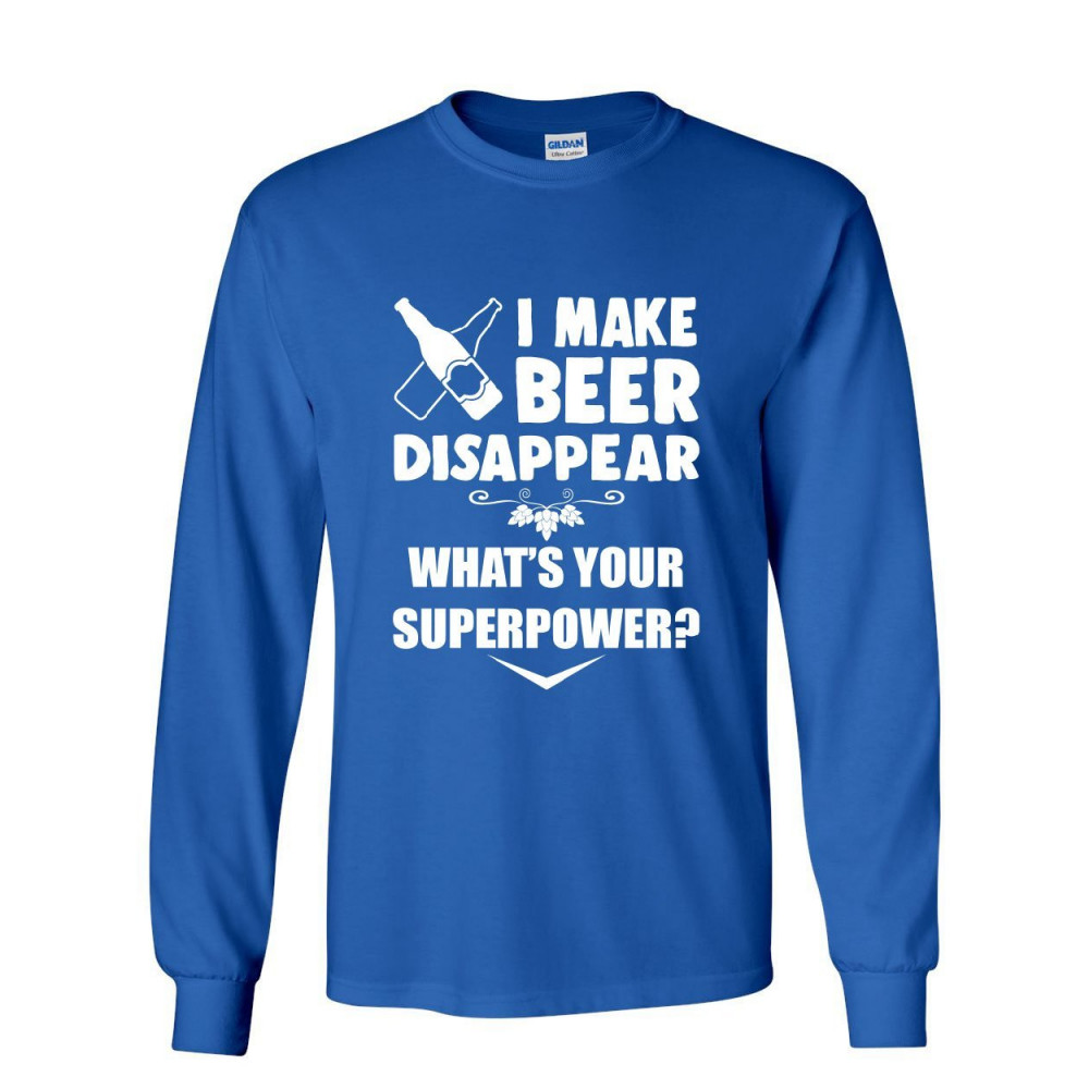 I MAKE BEER DISAPPEAR long sleeve t-shirt funny drinking superpower booze tee royal blue