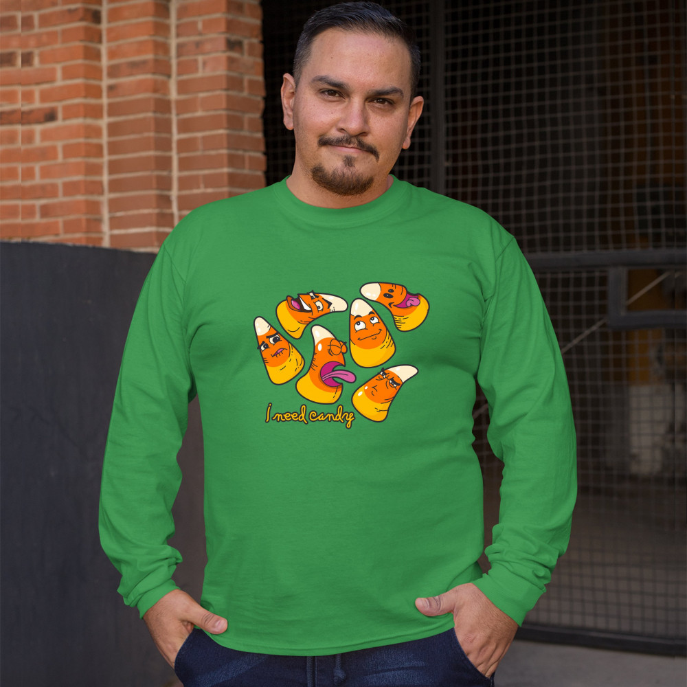 I NEED CANDY long sleeve t-shirt happy halloween trick-or-treating funny green