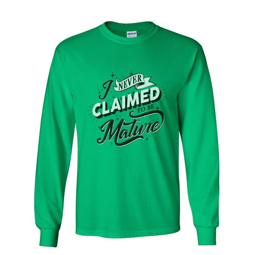 I NEVER CLAIMED TO BE MATURE long sleeve t-shirt funny sarcastic college tee green