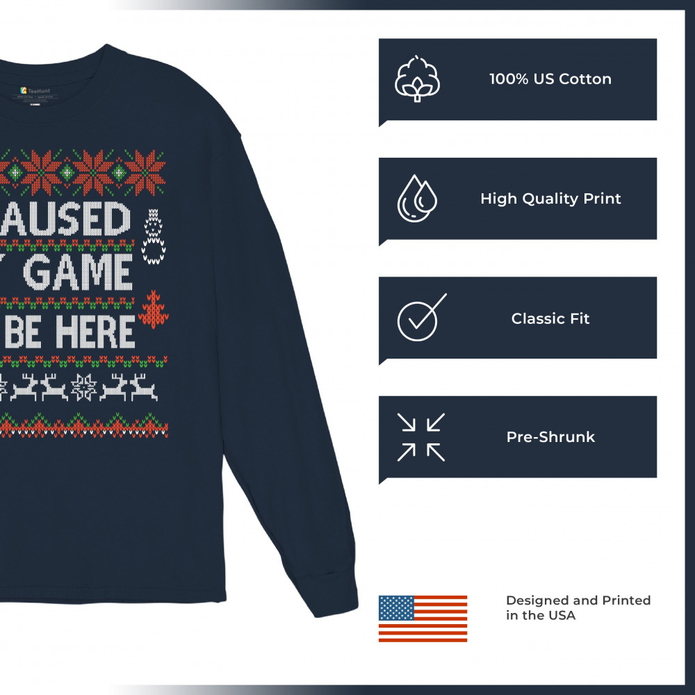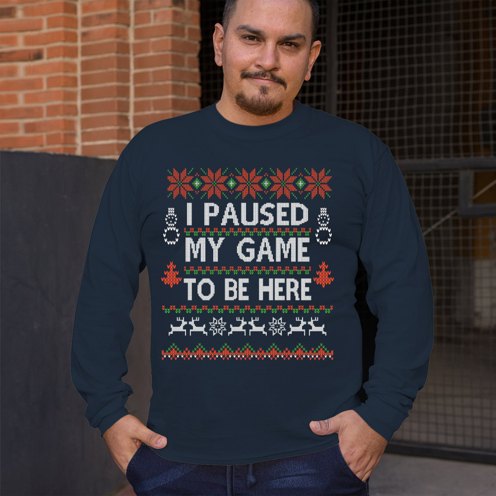 I PAUSED MY GAME TO BE HERE UGLY SWEATER THEME long sleeve t-shirt christmas navy blue