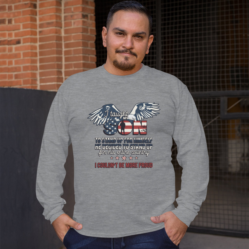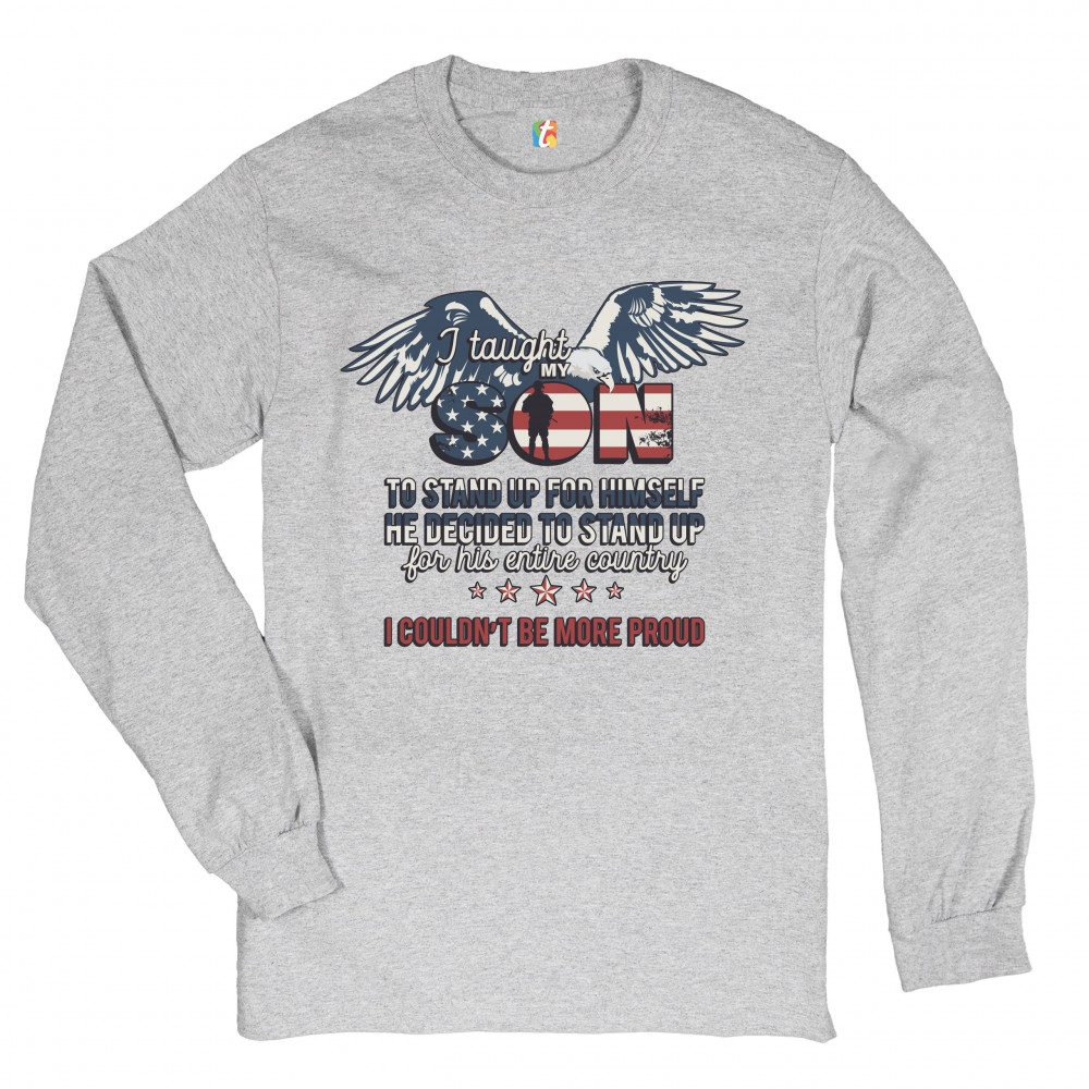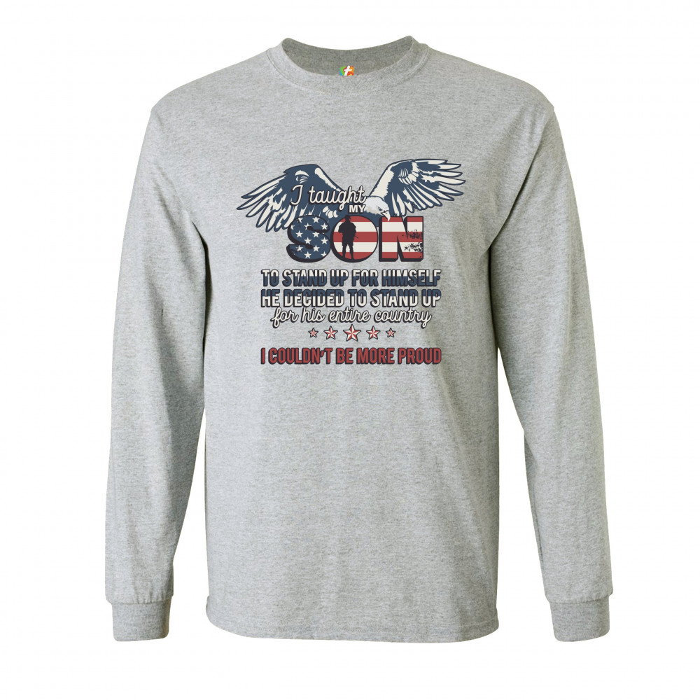 A patriotic print saying: "I Taught My Son to Stand up for Himself, He Decided to Stand Up for His Entire Country, I Couldn't Be More Proud". The print features a bald eagle, several stars and a small silhouette of a soldier inside of a letter "O" in "Son