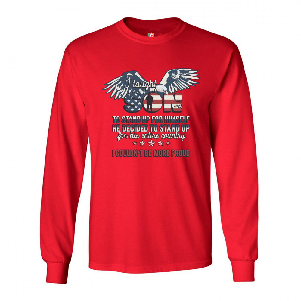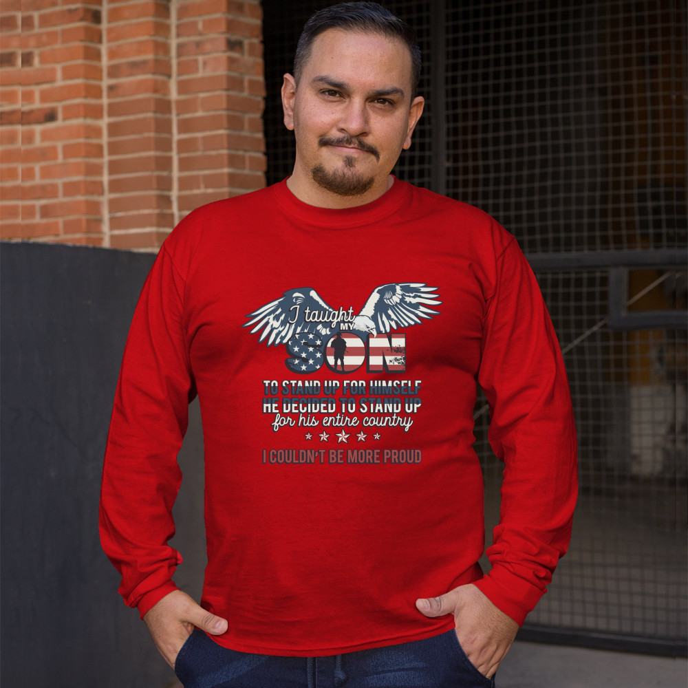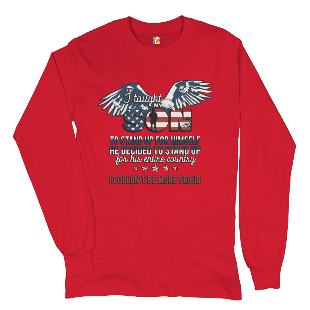 A patriotic print saying: "I Taught My Son to Stand up for Himself, He Decided to Stand Up for His Entire Country, I Couldn't Be More Proud". The print features a bald eagle, several stars and a small silhouette of a soldier inside of a letter "O" in "Son