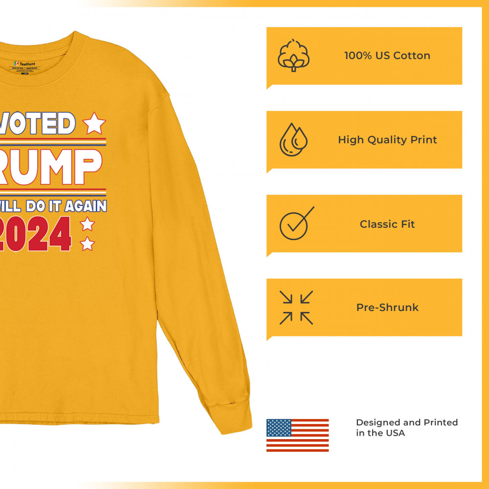 Stand tall as a dedicated Trump supporter with our "I Voted Trump and Will Do It Again 2024" design, showcasing your unwavering commitment to the America First agenda. Let the world know that you stand ready to cast your vote for President Trump once more