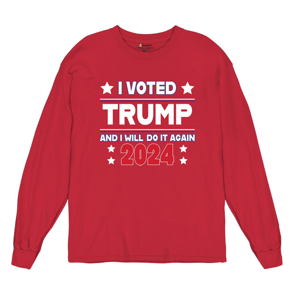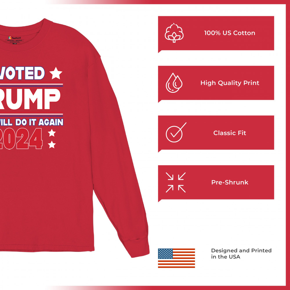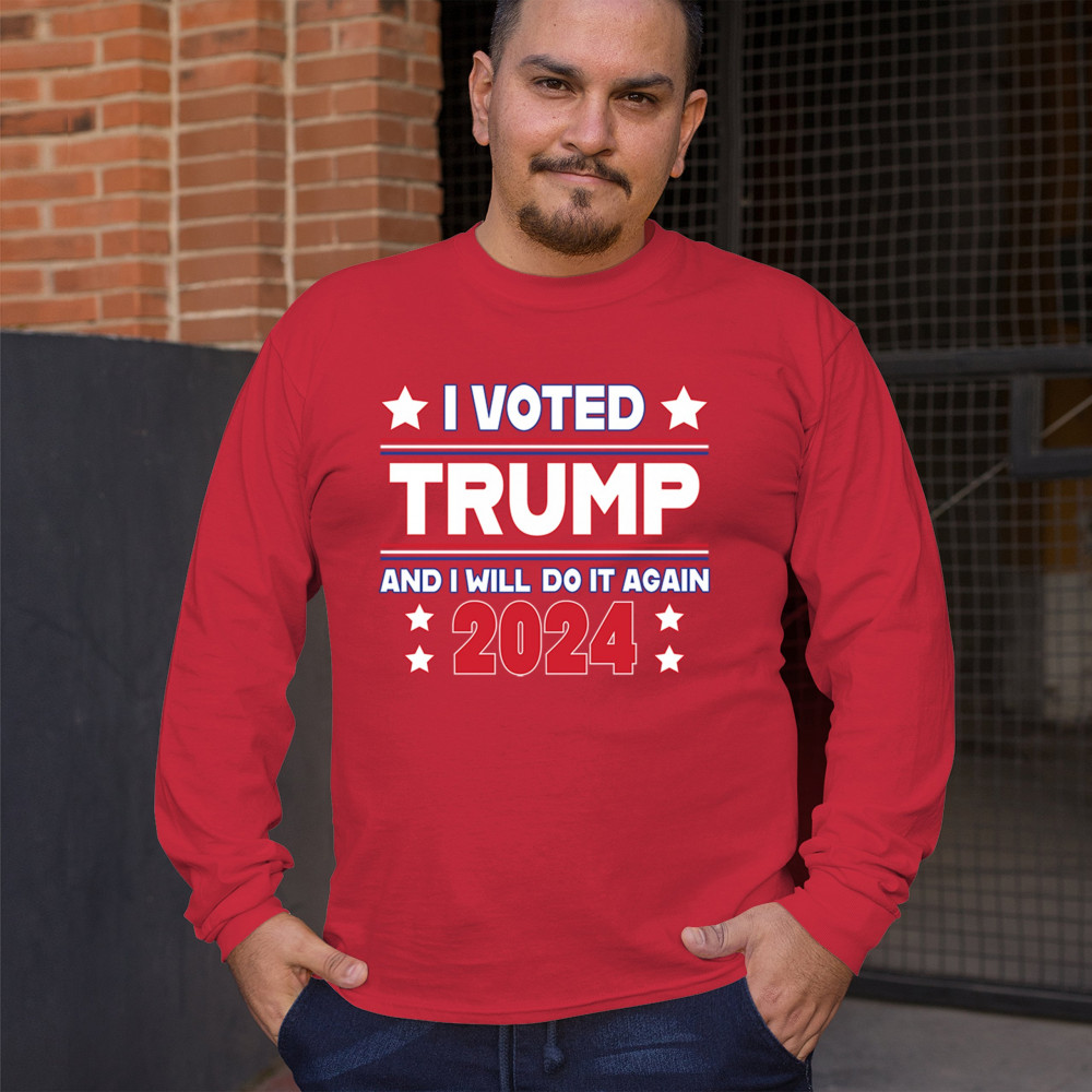 Stand tall as a dedicated Trump supporter with our "I Voted Trump and Will Do It Again 2024" design, showcasing your unwavering commitment to the America First agenda. Let the world know that you stand ready to cast your vote for President Trump once more