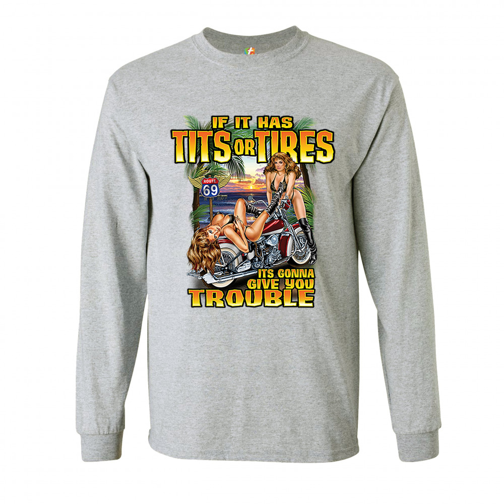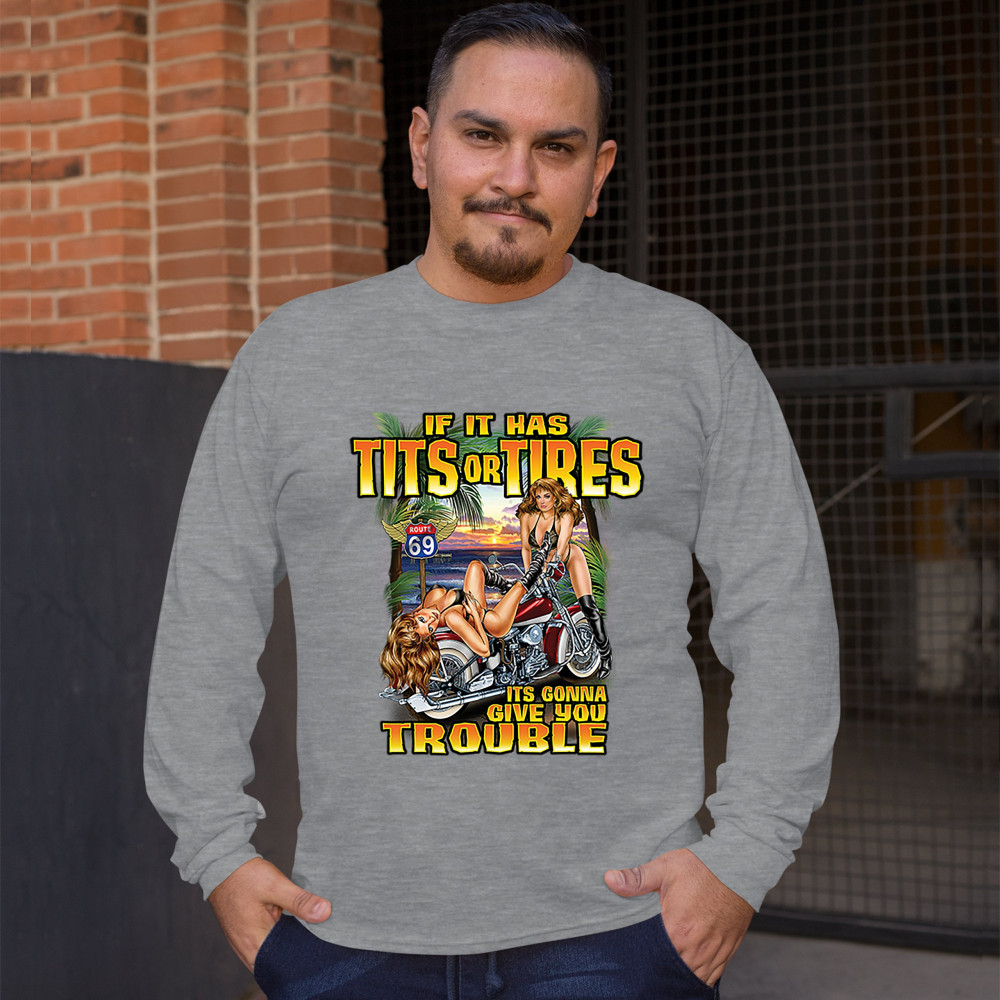 A print featuring two barely dressed sexy women leaning on a vintage motorcycle parked at the beach. There is a "Route 69" road sign in the background. The print says: "If it has tits or tires it's gonna give you trouble". A great choice for a motorcycle
