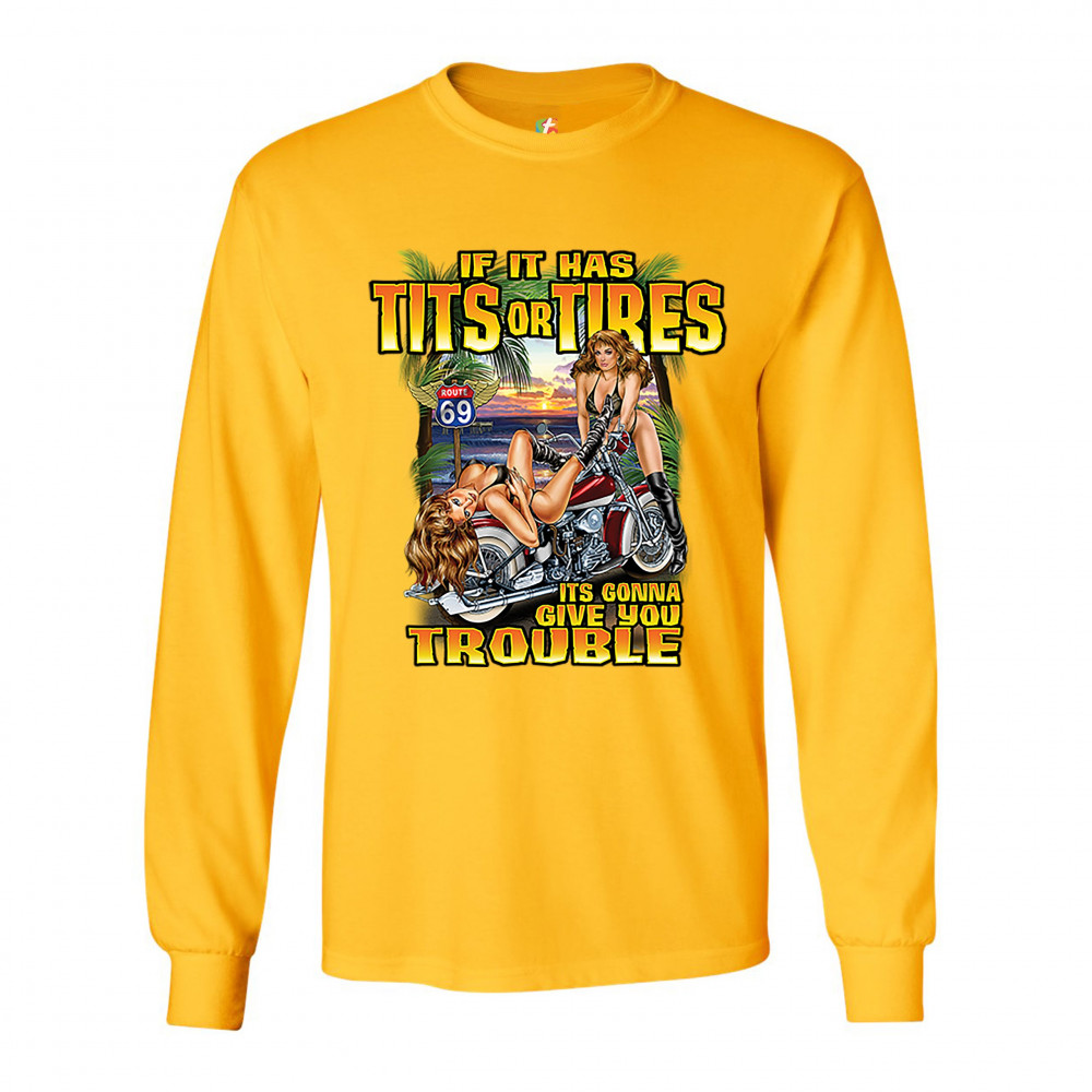 A print featuring two barely dressed sexy women leaning on a vintage motorcycle parked at the beach. There is a "Route 69" road sign in the background. The print says: "If it has tits or tires it's gonna give you trouble". A great choice for a motorcycle