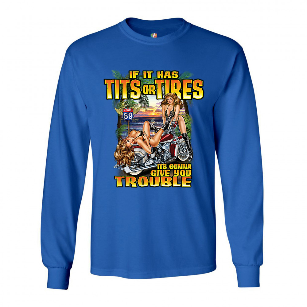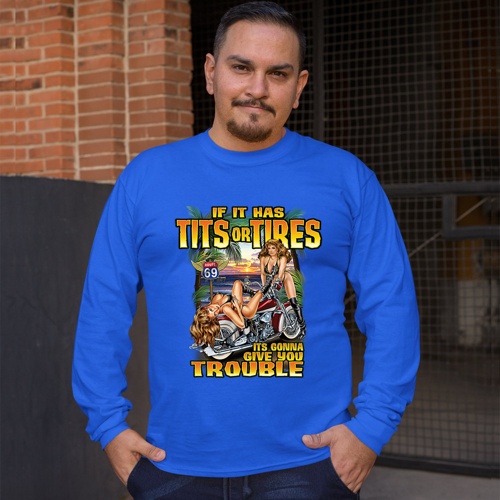 A print featuring two barely dressed sexy women leaning on a vintage motorcycle parked at the beach. There is a "Route 69" road sign in the background. The print says: "If it has tits or tires it's gonna give you trouble". A great choice for a motorcycle
