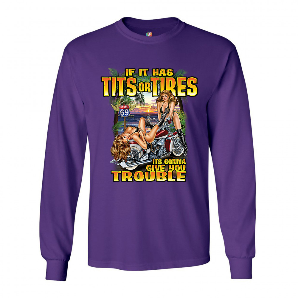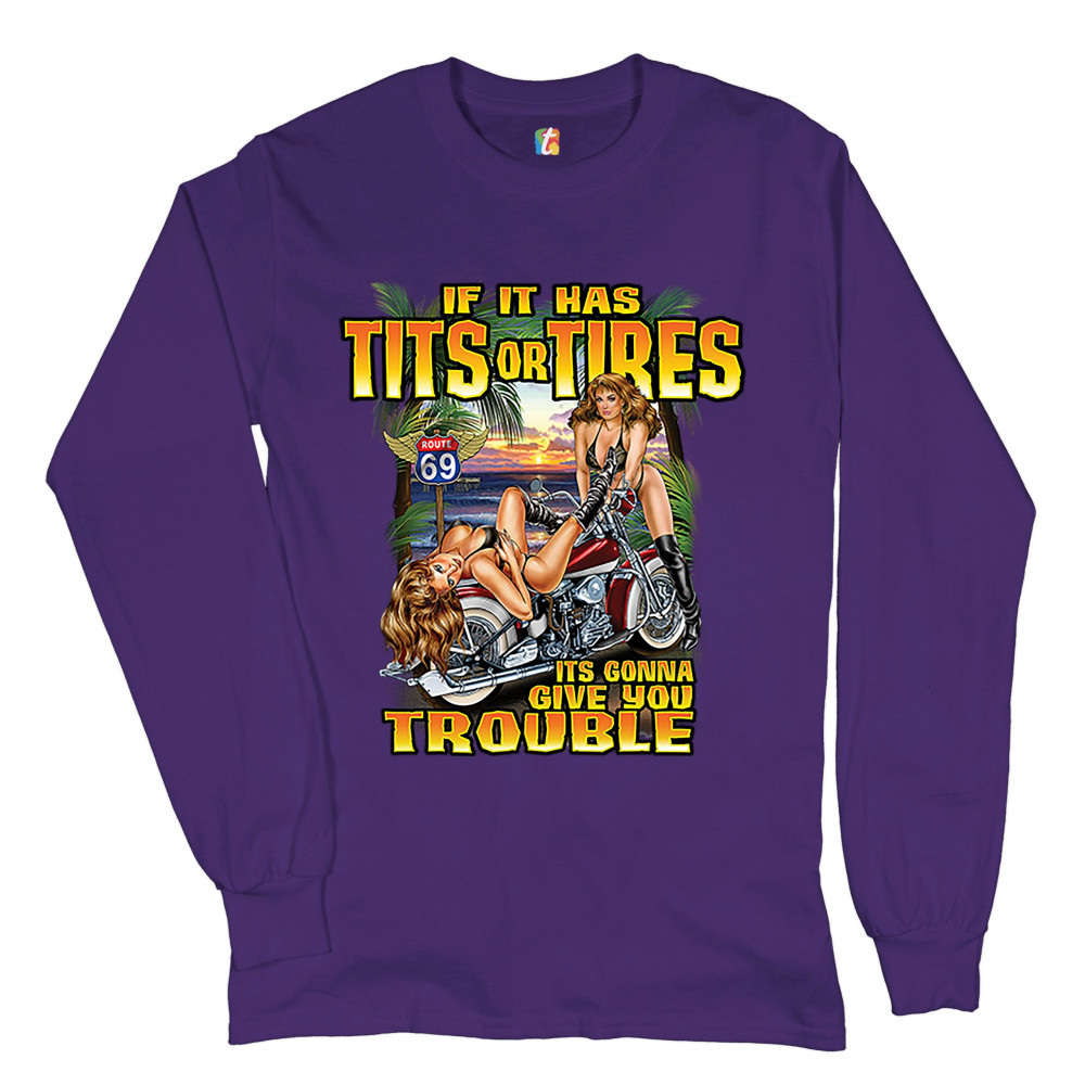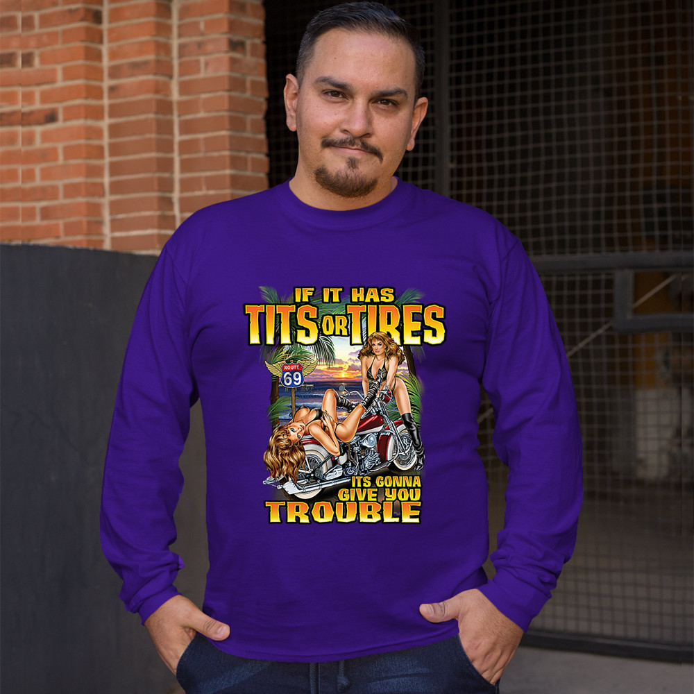 A print featuring two barely dressed sexy women leaning on a vintage motorcycle parked at the beach. There is a "Route 69" road sign in the background. The print says: "If it has tits or tires it's gonna give you trouble". A great choice for a motorcycle