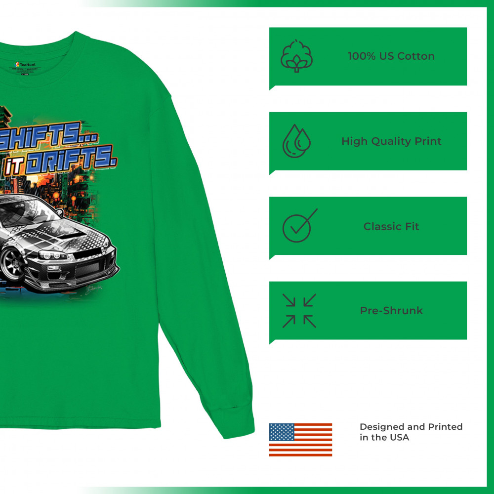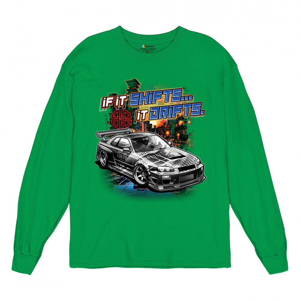 "If It Shifts, It Drifts" design. Perfect for car enthusiasts, featuring a detailed car and vibrant cityscape. Comfortable, durable, and stylish.