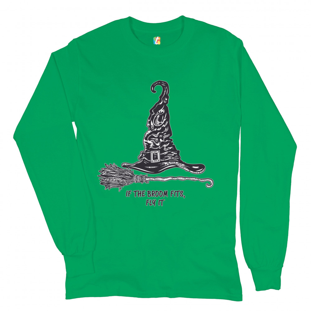 IF THE BROOM FITS, FLY IT long sleeve t-shirt funny witch hat halloween green