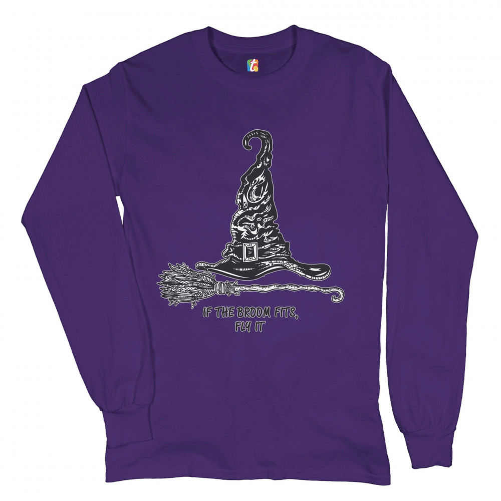 IF THE BROOM FITS, FLY IT long sleeve t-shirt funny witch hat halloween purple