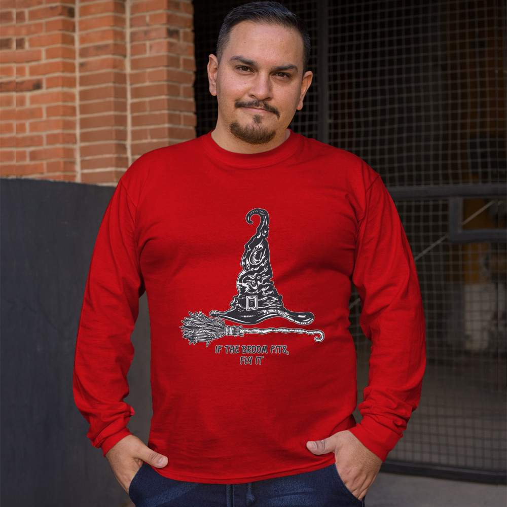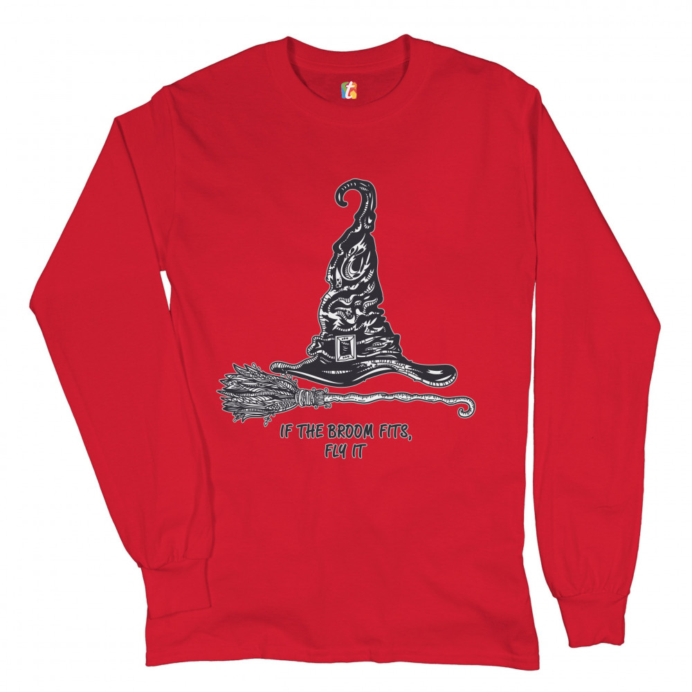 IF THE BROOM FITS, FLY IT long sleeve t-shirt funny witch hat halloween red