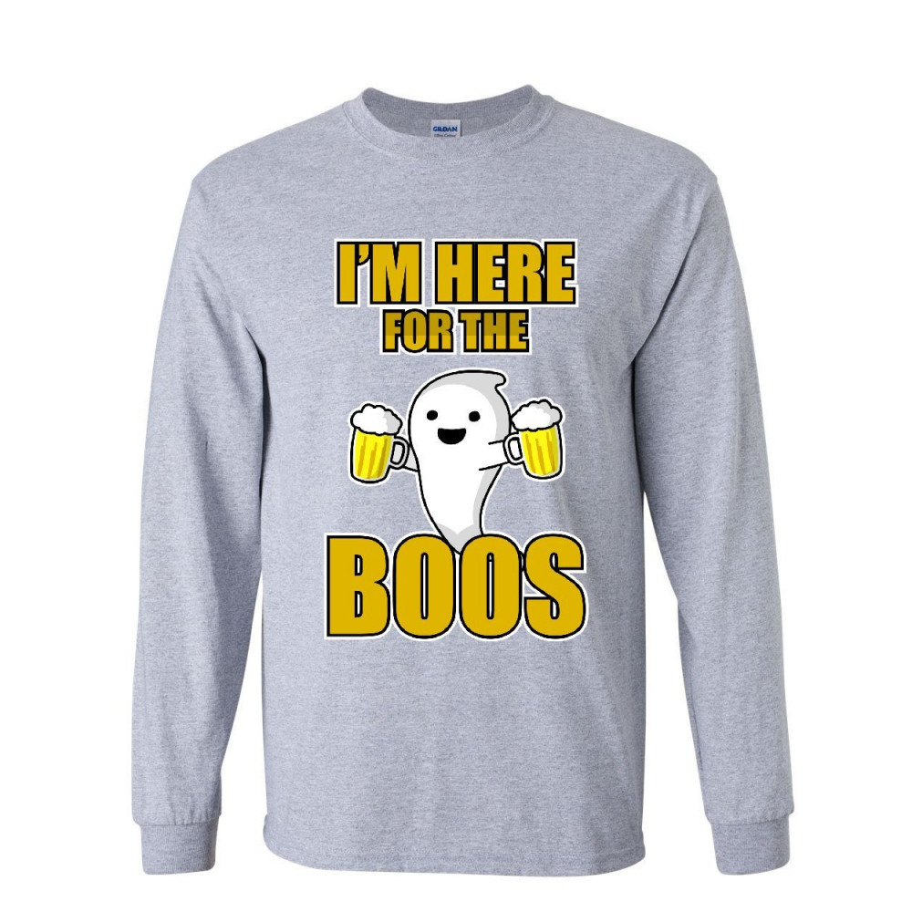 I'M HERE FOR THE BOOS long sleeve t-shirt halloween ghost drinking beer mug tee gray