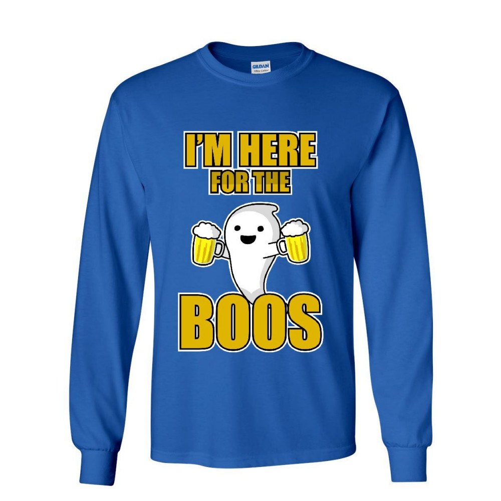 I'M HERE FOR THE BOOS long sleeve t-shirt halloween ghost drinking beer mug tee royal blue