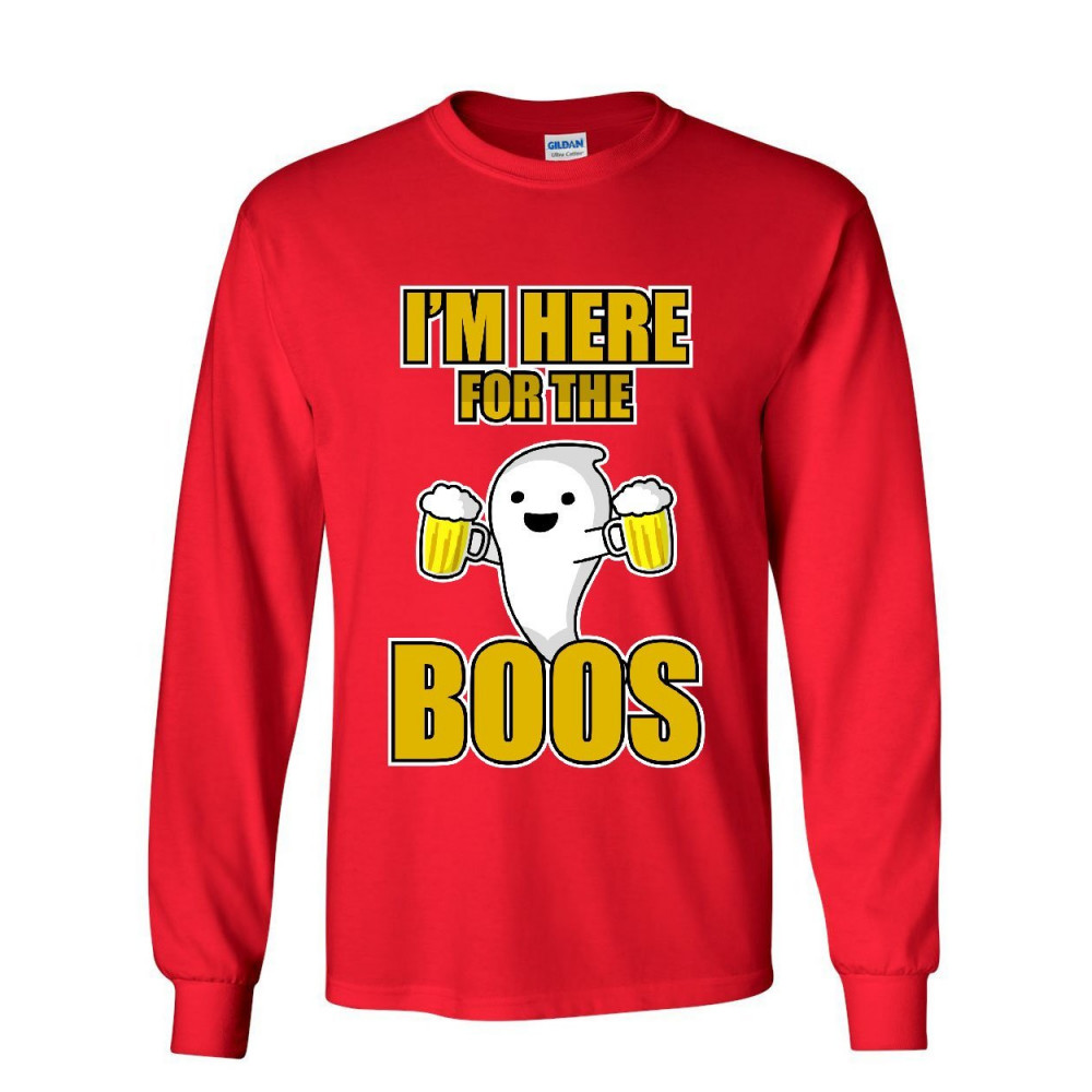 I'M HERE FOR THE BOOS long sleeve t-shirt halloween ghost drinking beer mug tee red