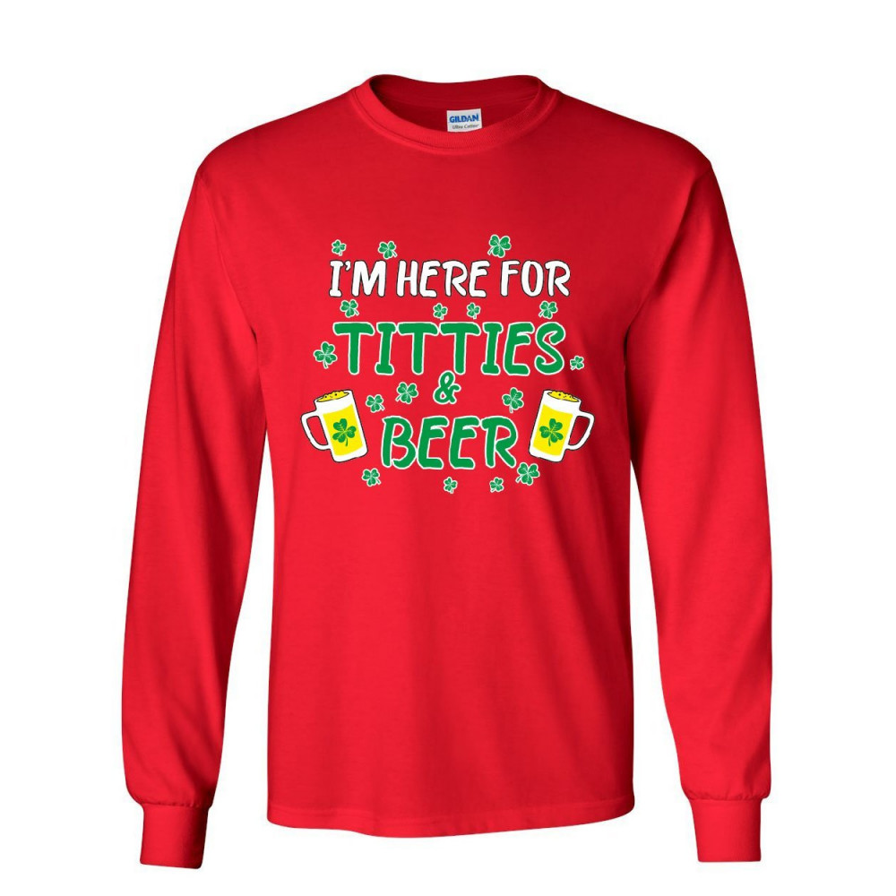 I'M HERE FOR TITTIES & BEER long sleeve t-shirt st patrick's day shenanigans tee red