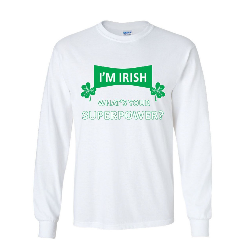 I'M IRISH WHAT'S YOUR SUPERPOWER? long sleeve t-shirt irish shamrock clover tee white