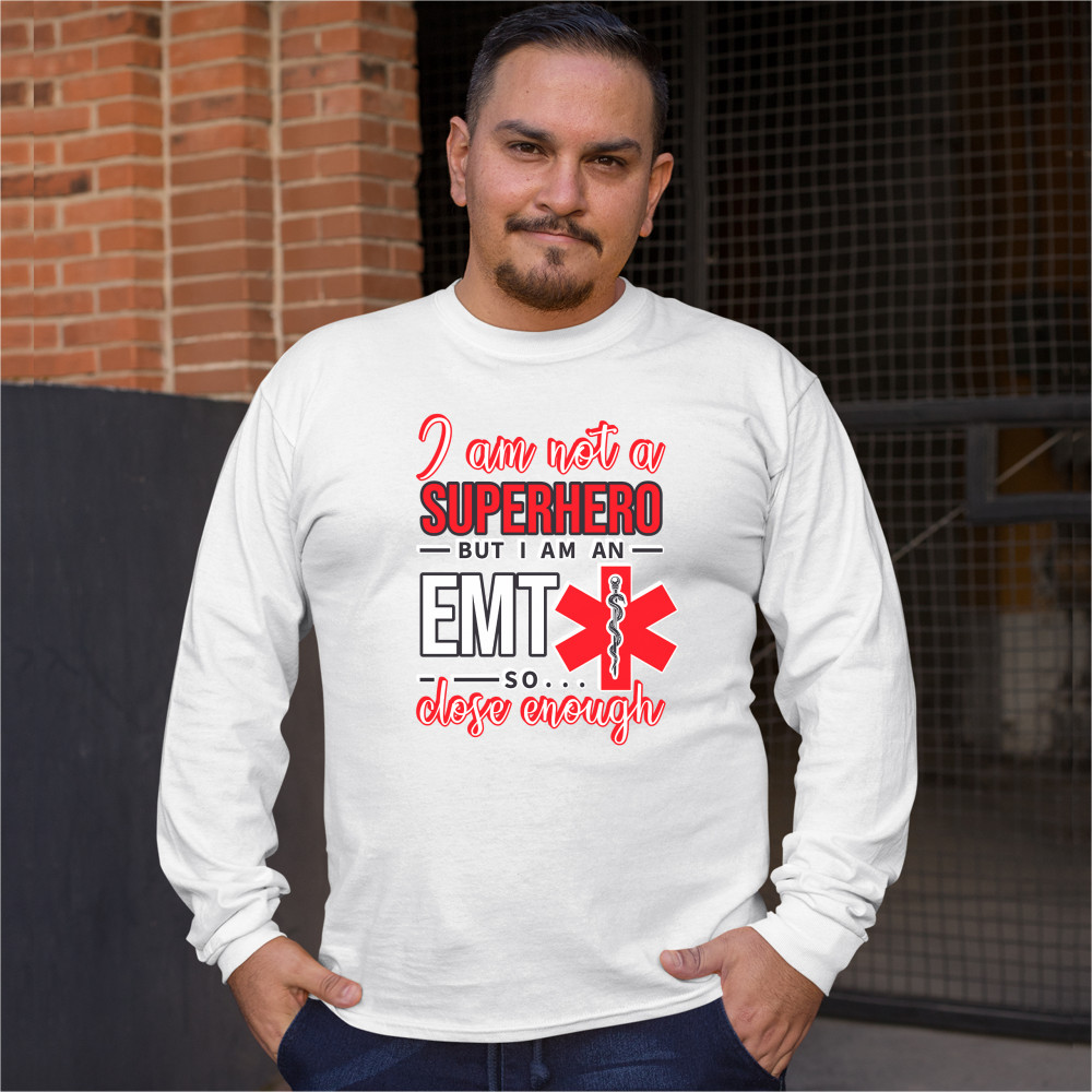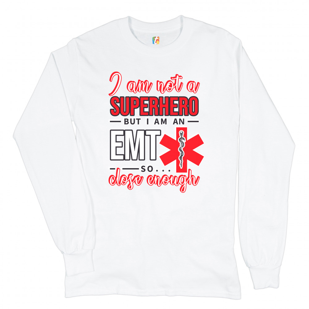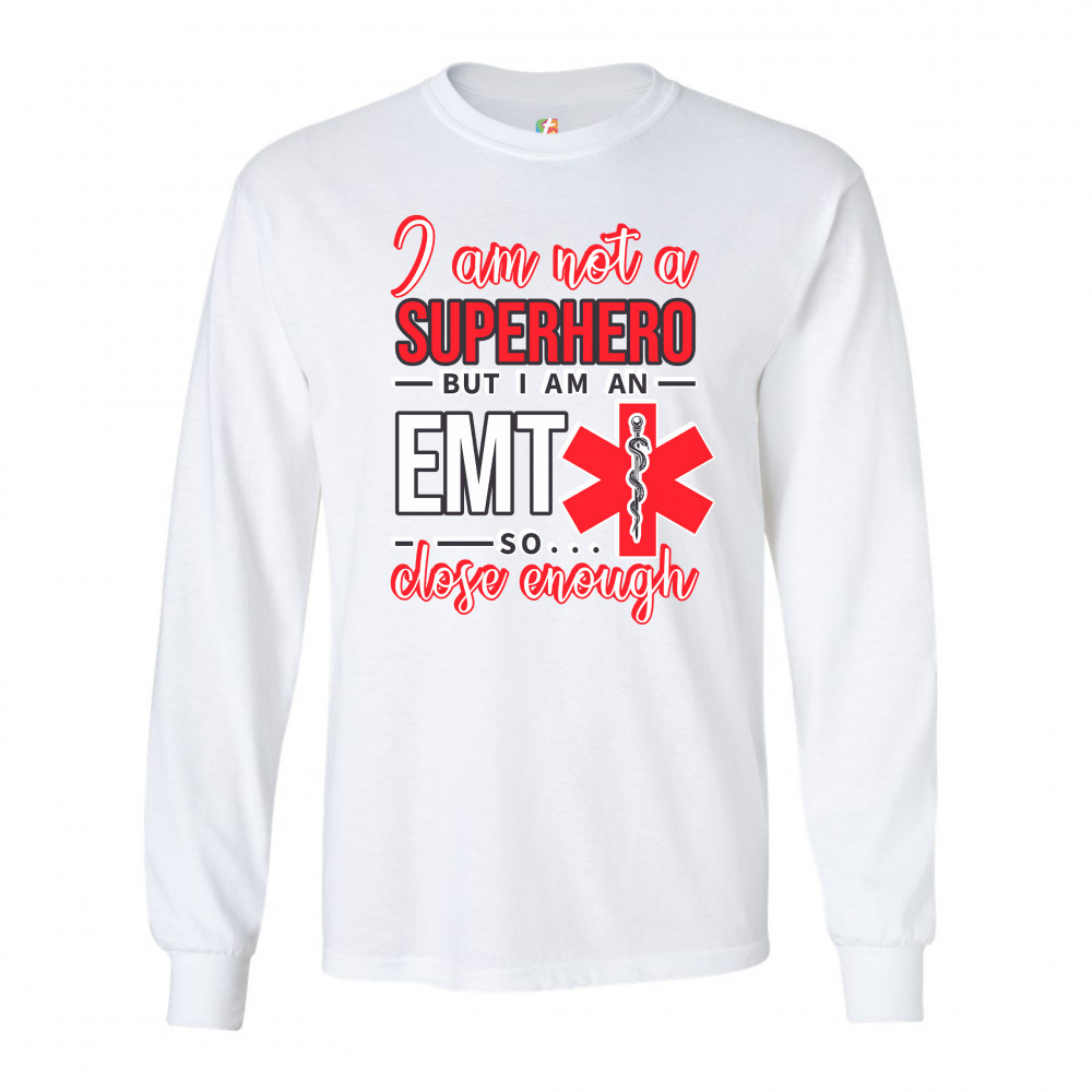 A funny print saying "I'm Not a Superhero But I'm an EMT so Close Enough". All words are written in different fonts. The print also includes the Star of Life, the worldwide recognized symbol of emergency medical services, with the Rod of Asclepius inside of it. A great choice as a gift for a first responder.