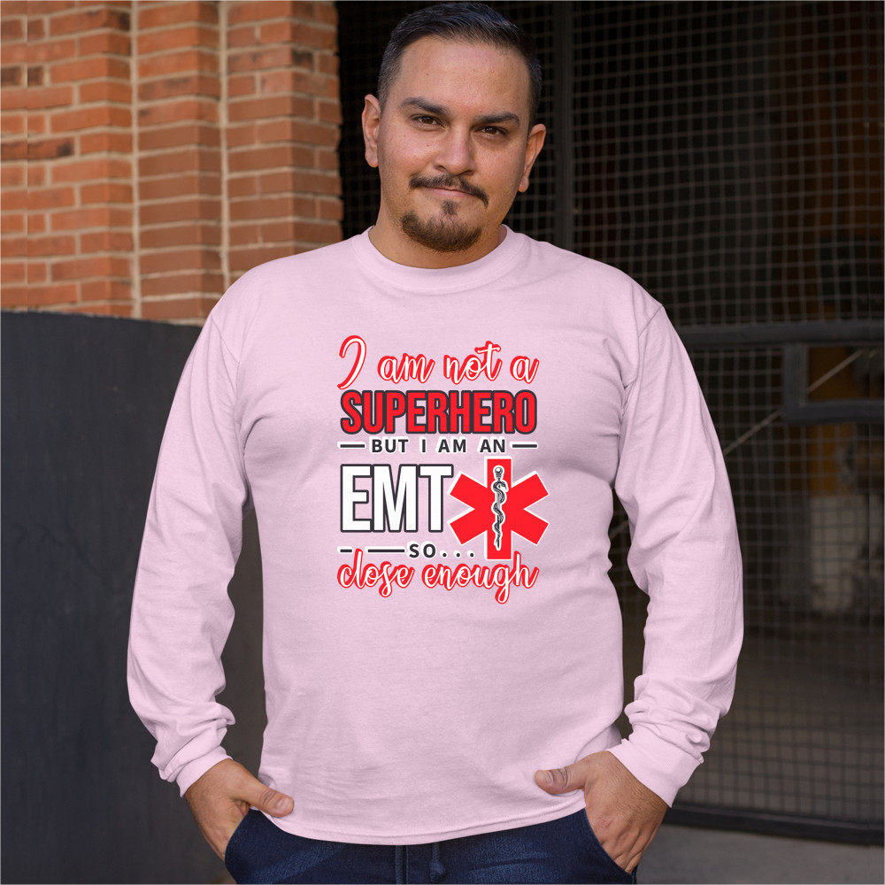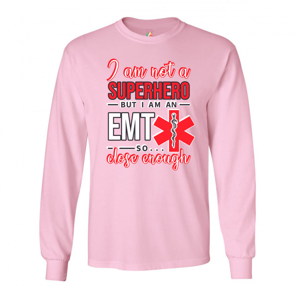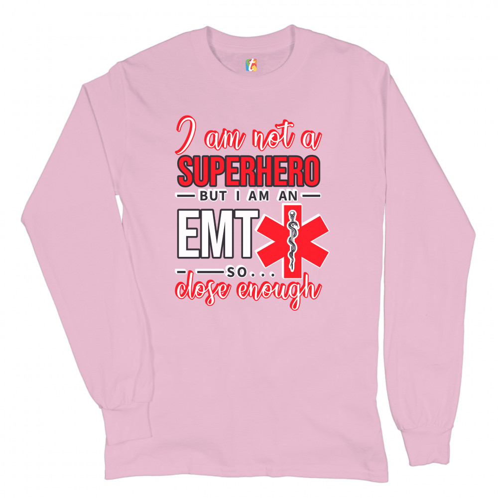 A funny print saying "I'm Not a Superhero But I'm an EMT so Close Enough". All words are written in different fonts. The print also includes the Star of Life, the worldwide recognized symbol of emergency medical services, with the Rod of Asclepius inside of it. A great choice as a gift for a first responder.