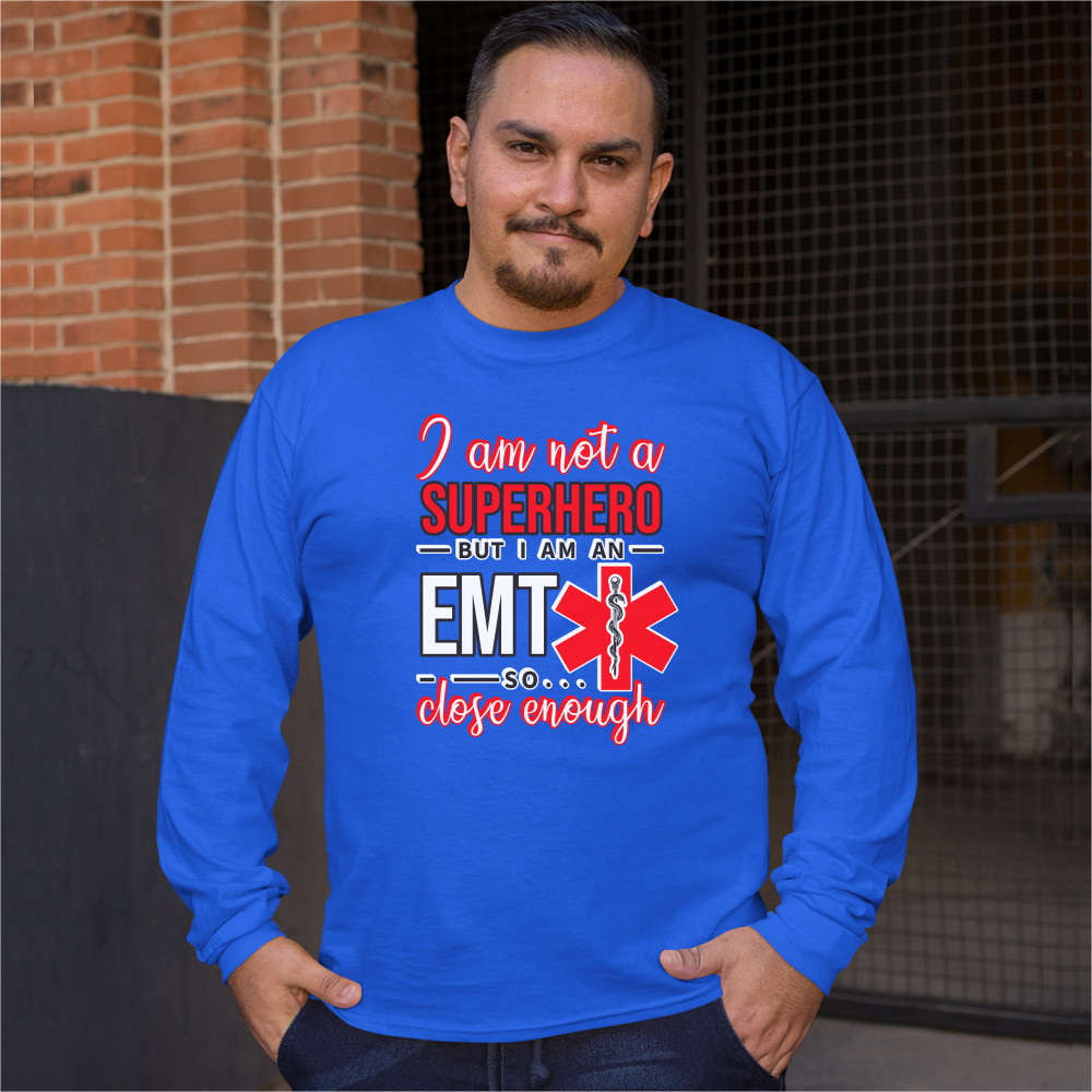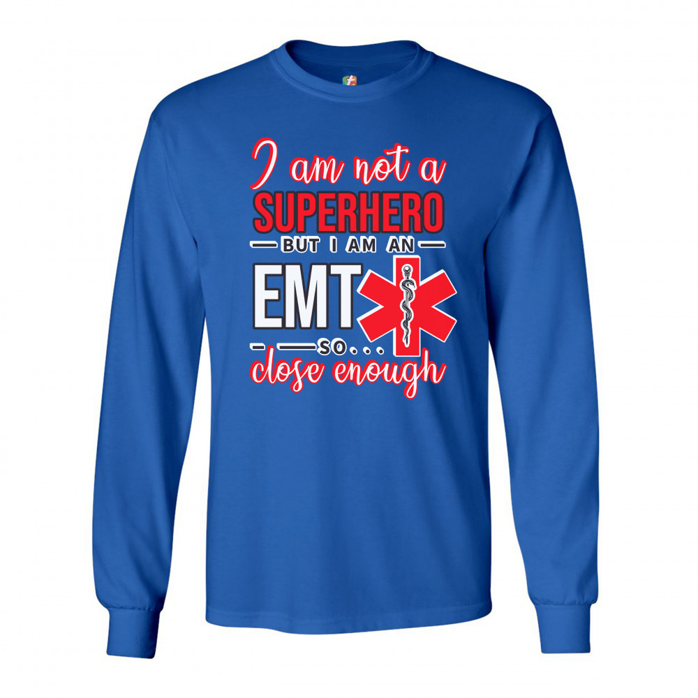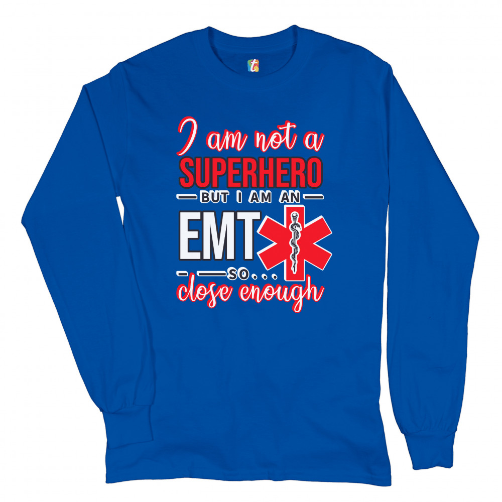 A funny print saying "I'm Not a Superhero But I'm an EMT so Close Enough". All words are written in different fonts. The print also includes the Star of Life, the worldwide recognized symbol of emergency medical services, with the Rod of Asclepius inside of it. A great choice as a gift for a first responder.