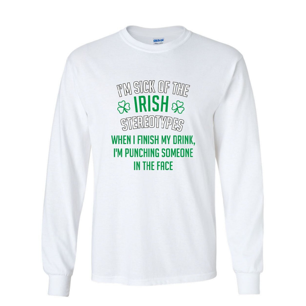SICK OF THE IRISH STEREOTYPES i'm sick of irish stereotypes long sleeve t-shirt st. patrick's day beer pub tee white