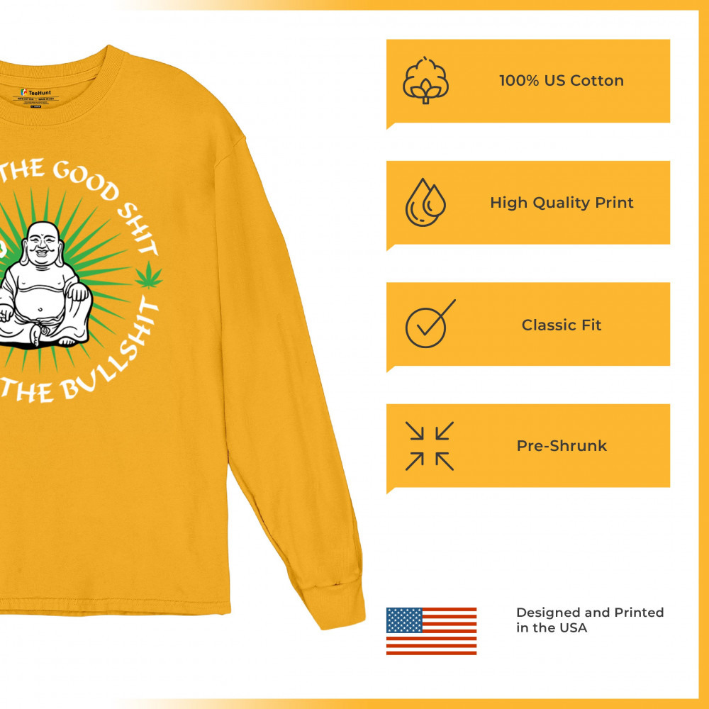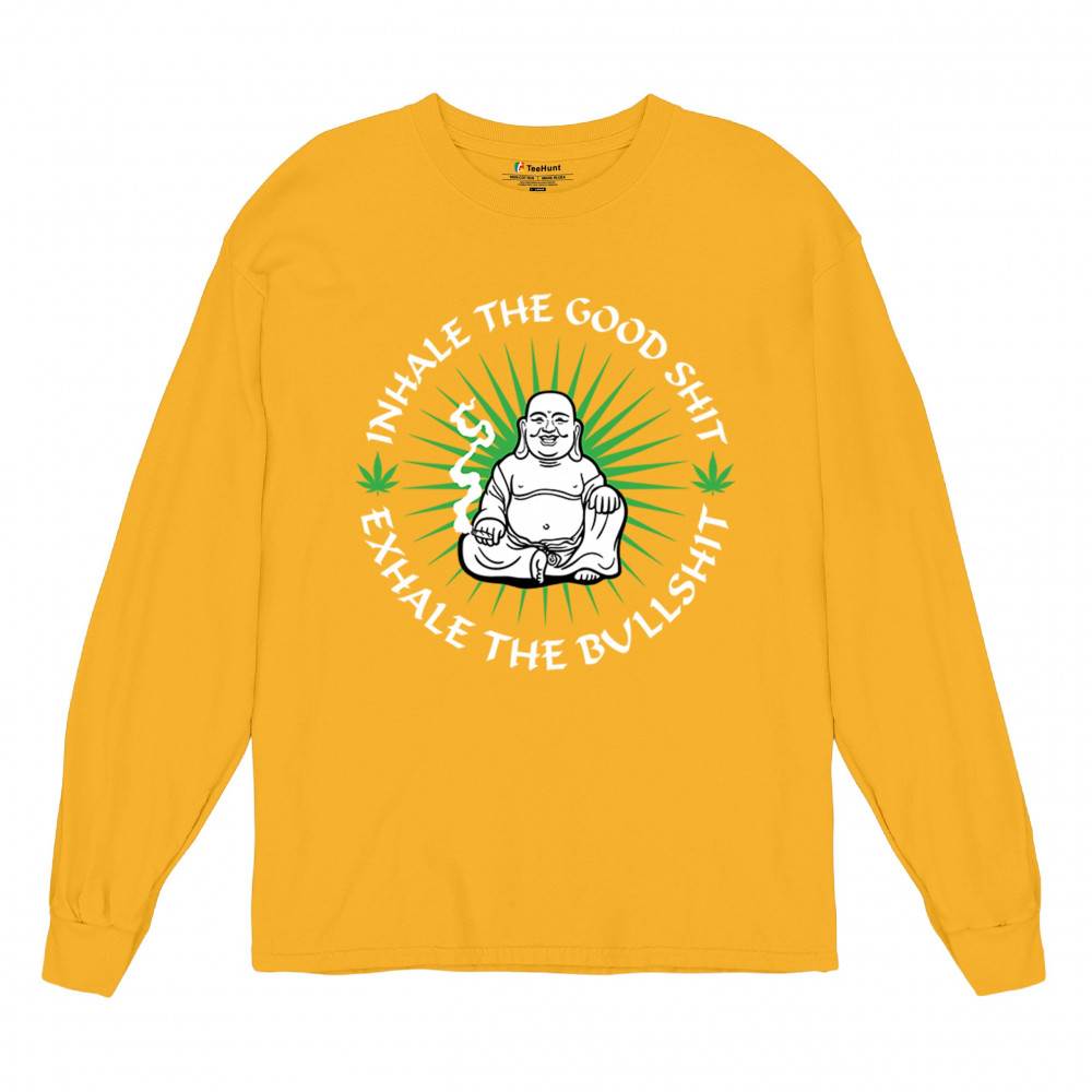 This hilarious and zen-inspired design features a happy Buddha with a joint, surrounded by cannabis leaves. “Inhale the Good Shit, Exhale the Bullshit†delivers chill stoner wisdom with a wink. Ideal for mindful marijuana lovers, 420 fans, or spiritual rebels with a sense of humor and a love for weed.