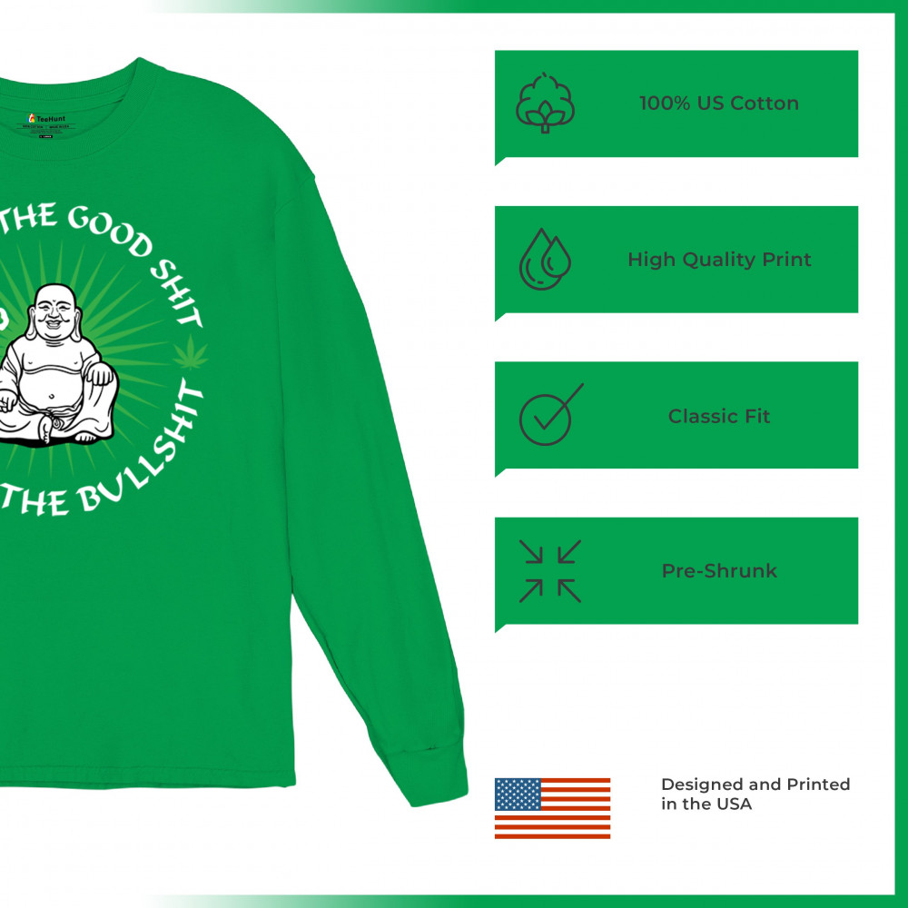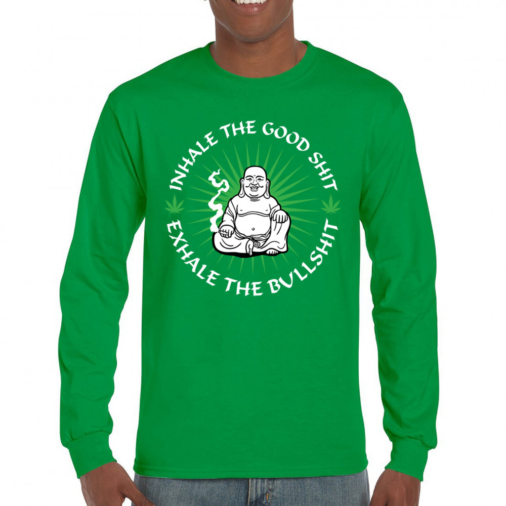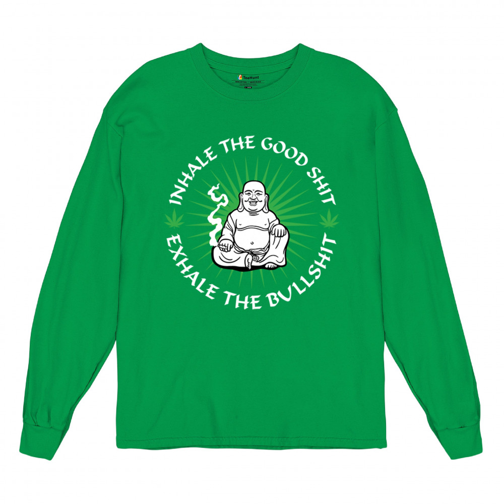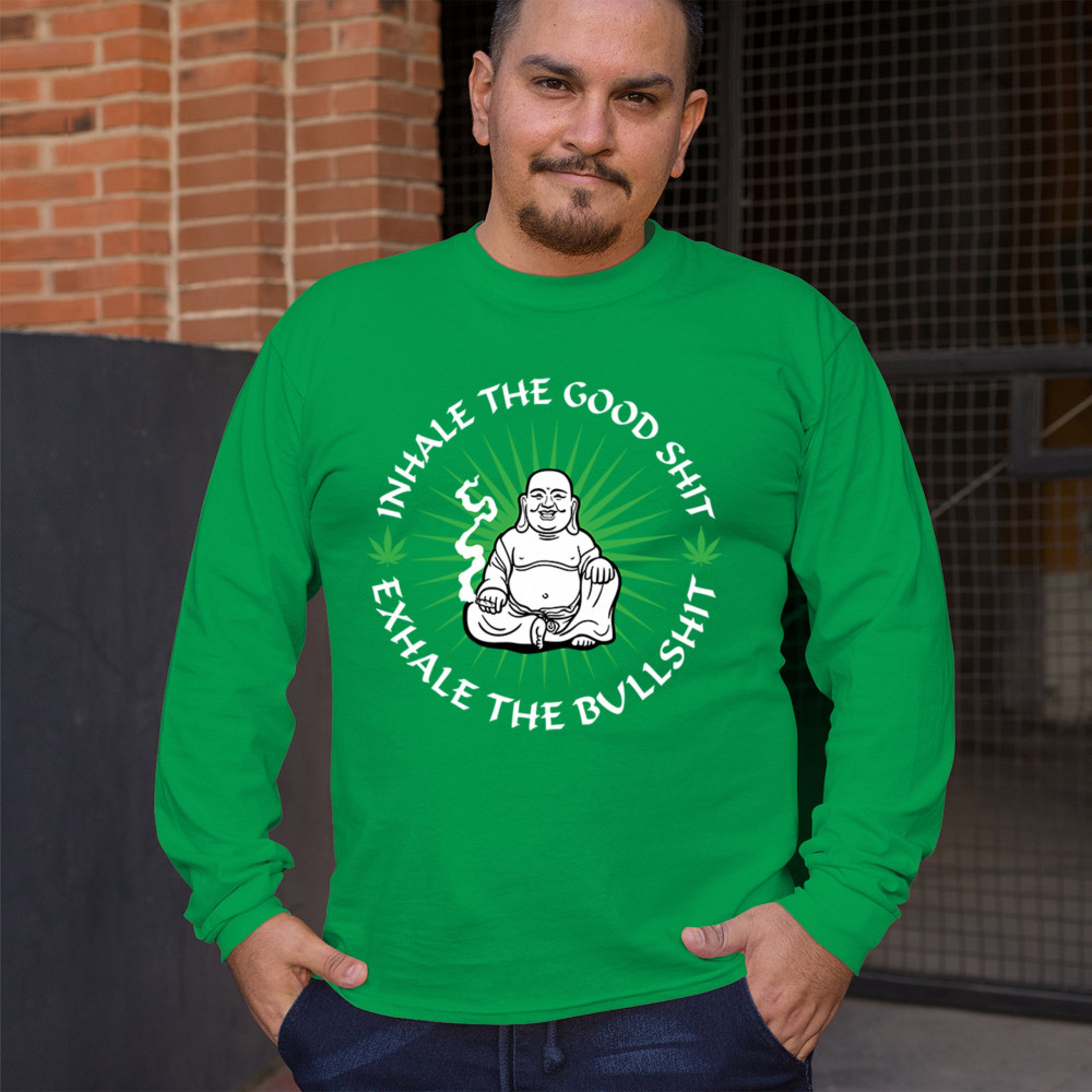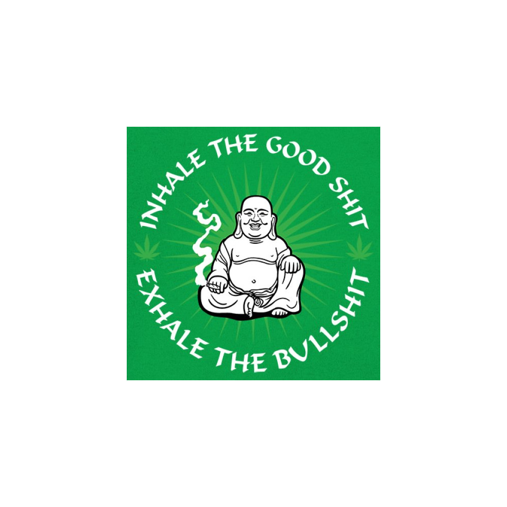 This hilarious and zen-inspired design features a happy Buddha with a joint, surrounded by cannabis leaves. “Inhale the Good Shit, Exhale the Bullshit†delivers chill stoner wisdom with a wink. Ideal for mindful marijuana lovers, 420 fans, or spiritual rebels with a sense of humor and a love for weed.
