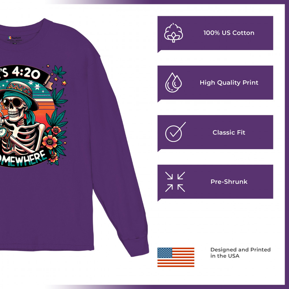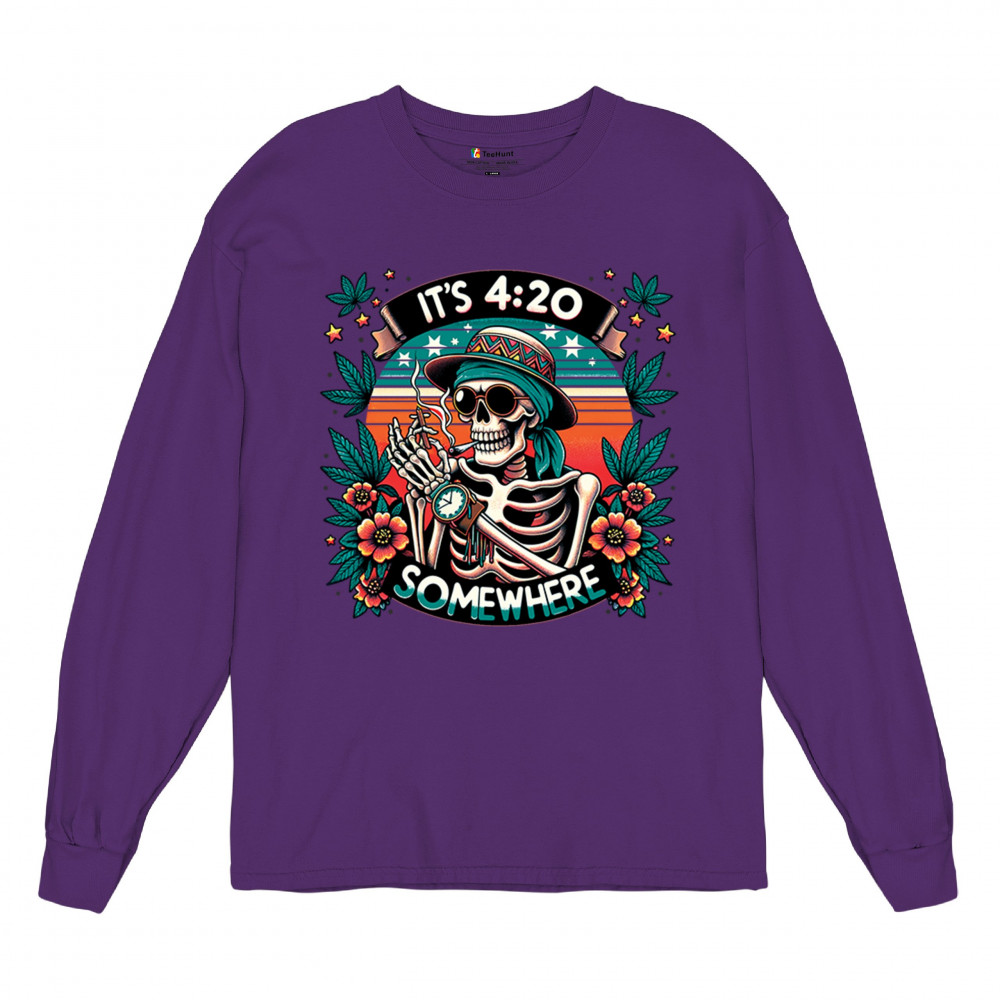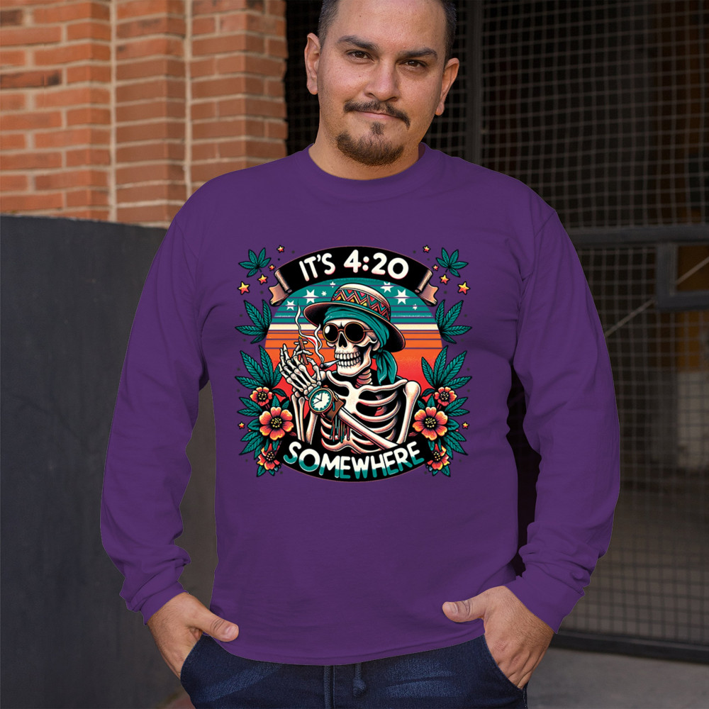 Get lifted with this “It’s 4:20 Somewhere†design featuring a joint-smoking skeleton, tropical sunset, and Deadhead stoner vibes. With bold trippy colors and beachy weed art, this tee is perfect for April 20 parties, summer festivals, and cannabis lovers living the high life.