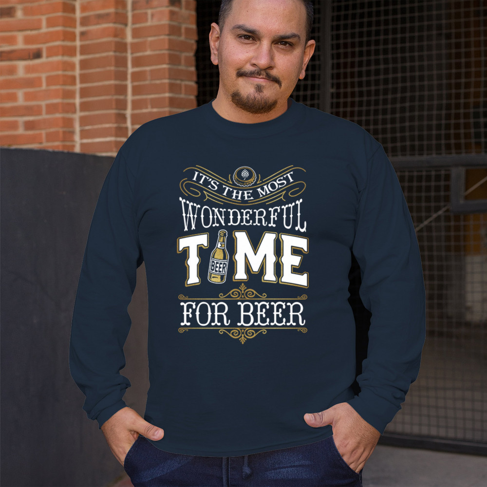 Bring some holiday cheer to your wardrobe with our "It's The Most Wonderful Time for Beer" design. Featuring a festive beer bottle and playful text, this design is perfect for adding humor to holiday gatherings, beer festivals, or any casual outing. Ideal for beer lovers and brew enthusiasts, it makes a fantastic gift for those who appreciate beer-themed fun. Embrace the season and your love for beer with this delightful and humorous design!
