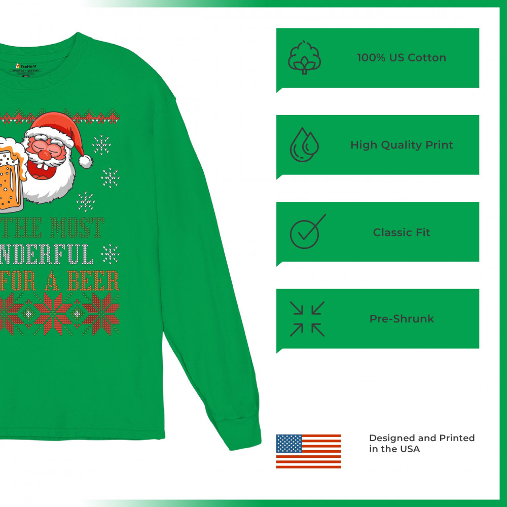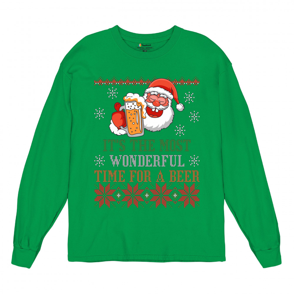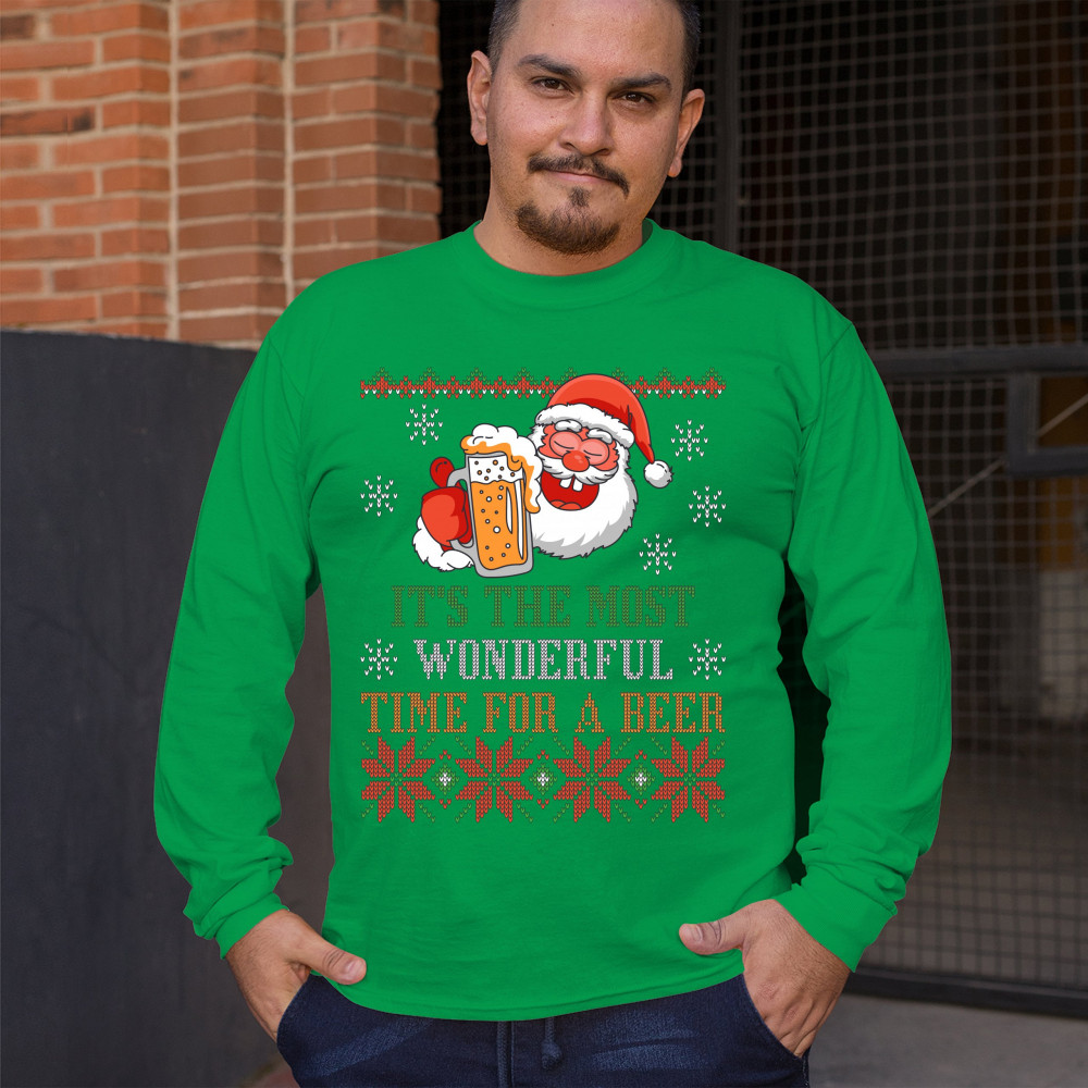A print saying: "It's the Most Wonderful Time for a Beer" and featuring Santa Claus holding a glass of beer. The print is designed as an ugly sweater. Amazing choice for a single person who wants to make people smile and spread positive vibes on Christmas