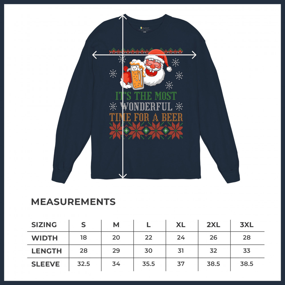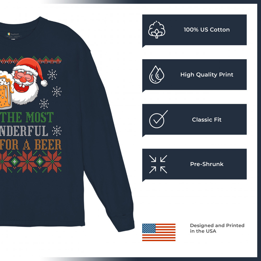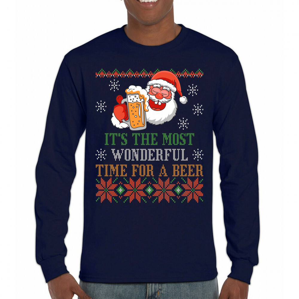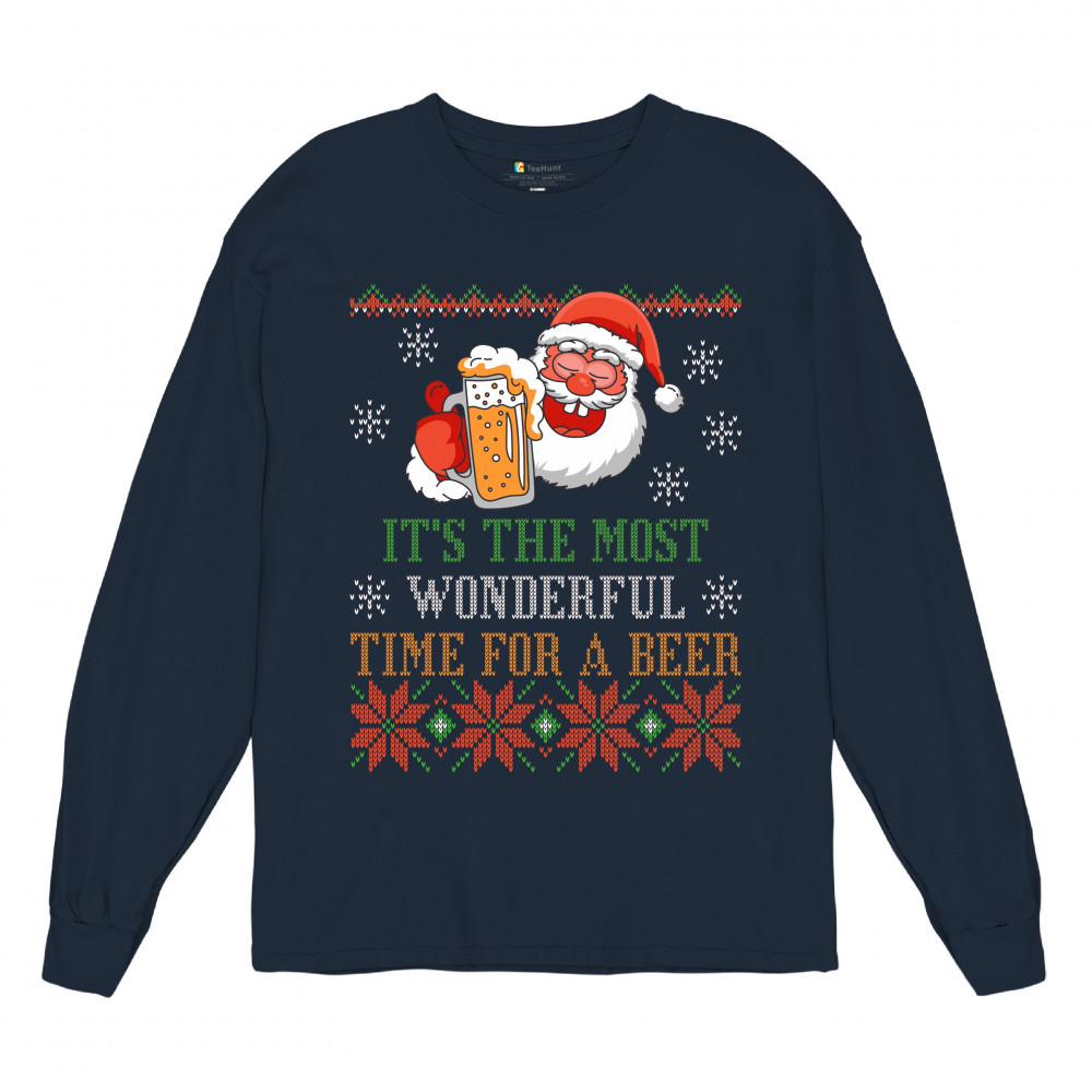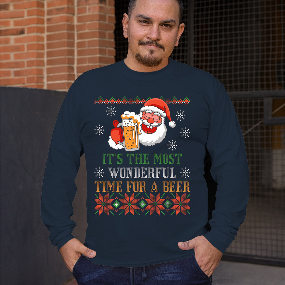 A print saying: "It's the Most Wonderful Time for a Beer" and featuring Santa Claus holding a glass of beer. The print is designed as an ugly sweater. Amazing choice for a single person who wants to make people smile and spread positive vibes on Christmas