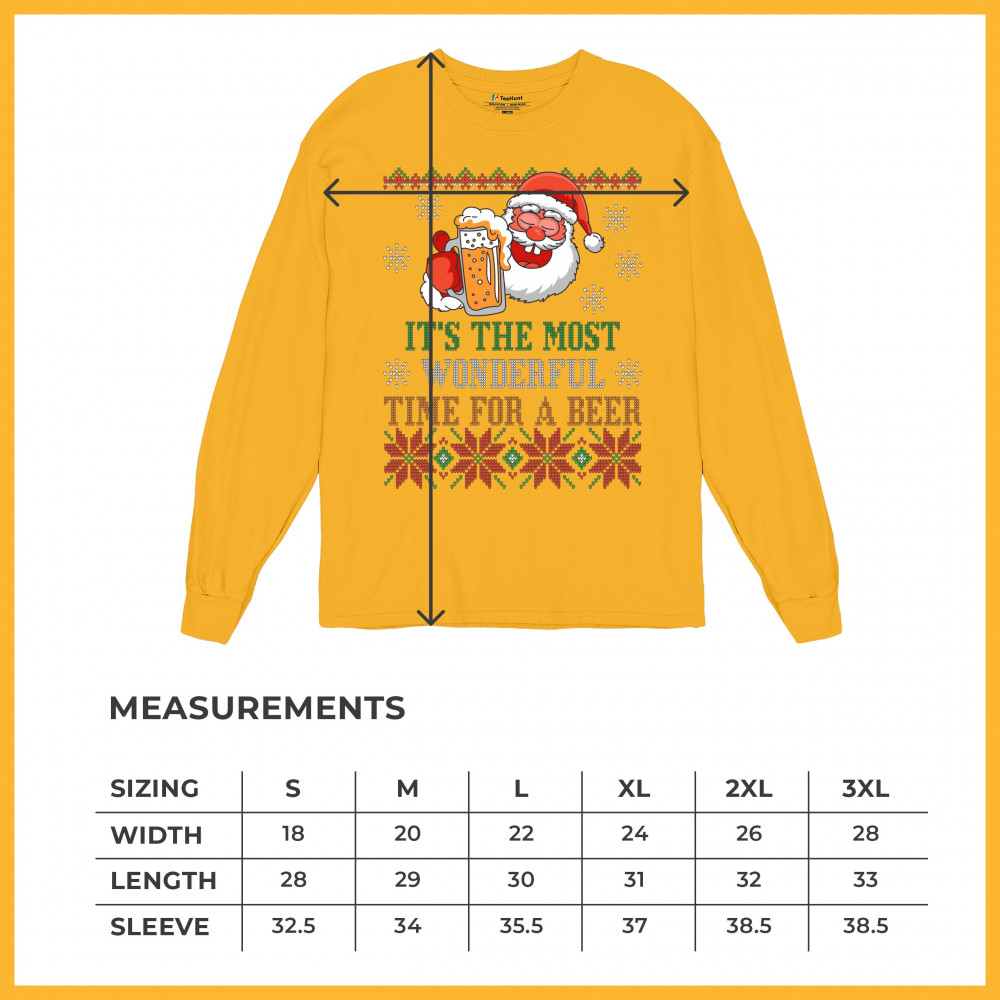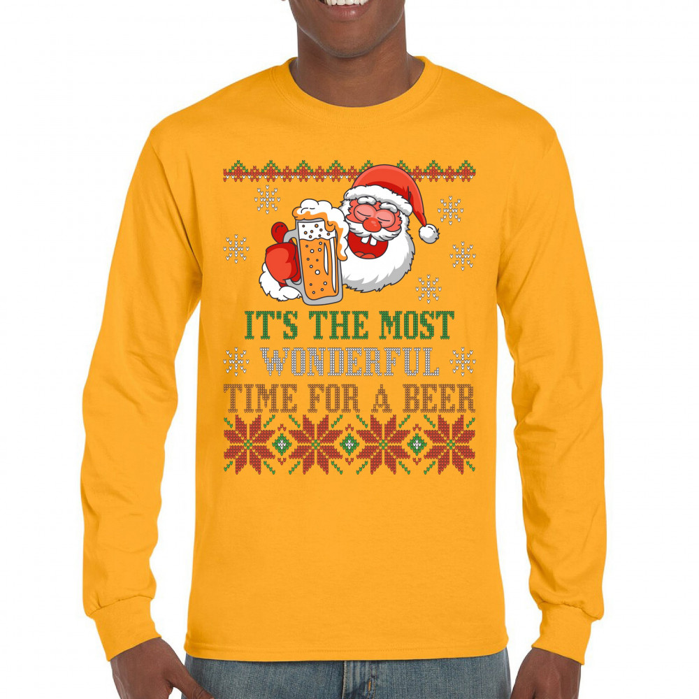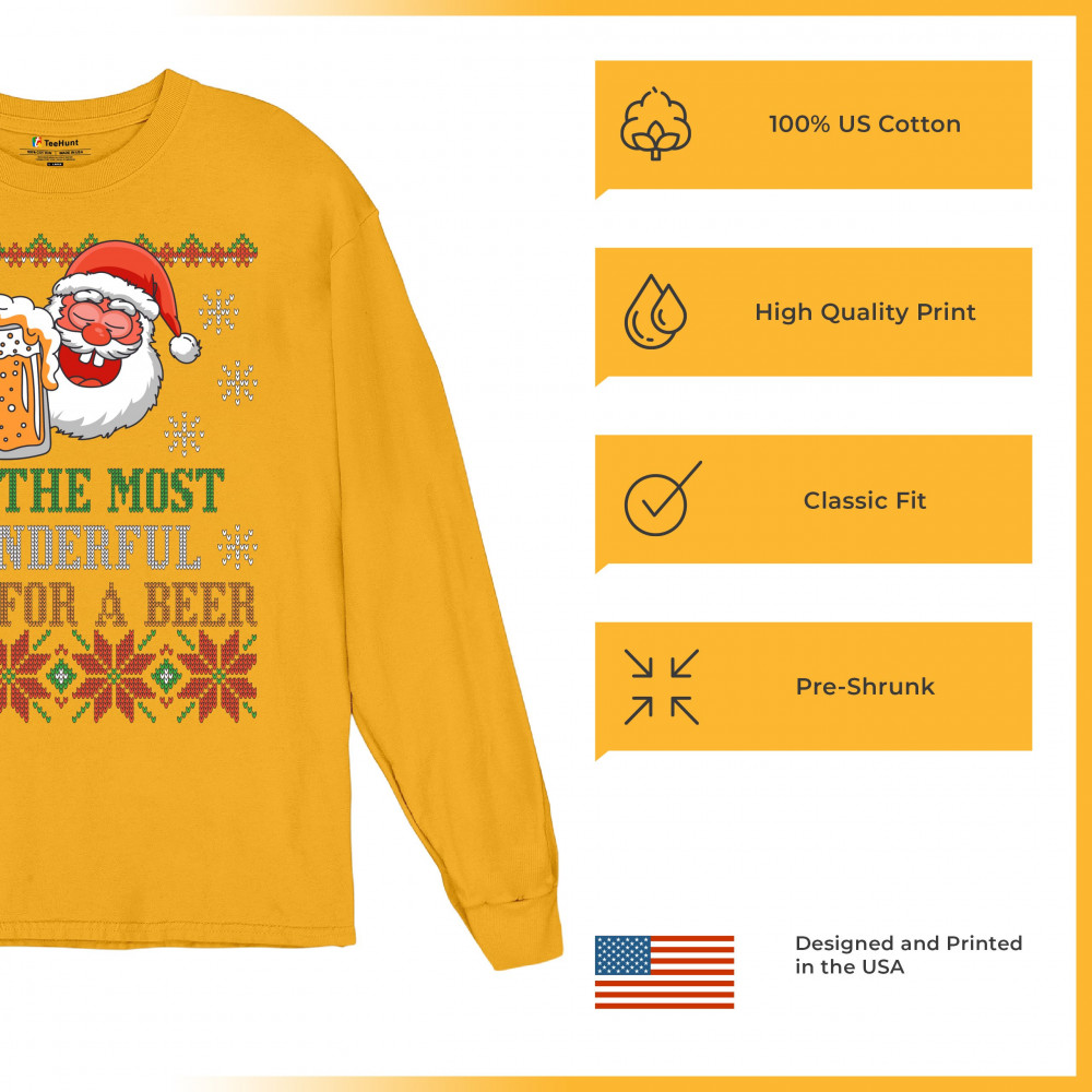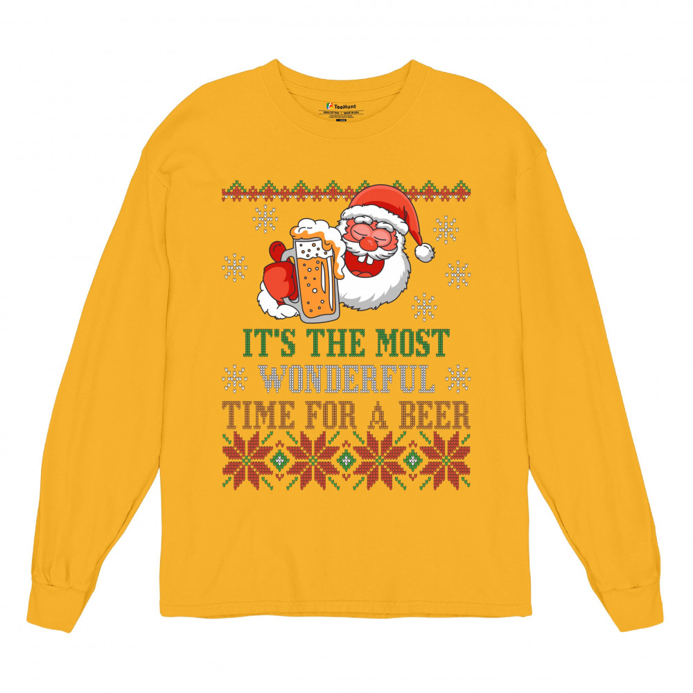 A print saying: "It's the Most Wonderful Time for a Beer" and featuring Santa Claus holding a glass of beer. The print is designed as an ugly sweater. Amazing choice for a single person who wants to make people smile and spread positive vibes on Christmas