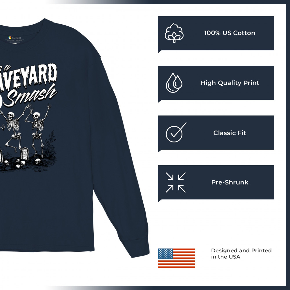 Add a touch of spooky fun to your Halloween attire with this "Graveyard Smash" design, showcasing skeletons dancing under the moonlight in a graveyard. Ideal for anyone who loves Halloween, this graphic tee is perfect for parties, haunted houses, or casual trick-or-treating. Made from high-quality materials, it offers both comfort and style, ensuring you look great while embracing the festive spirit. Available in multiple sizes, this shirt is a must-have for your Halloween collection.