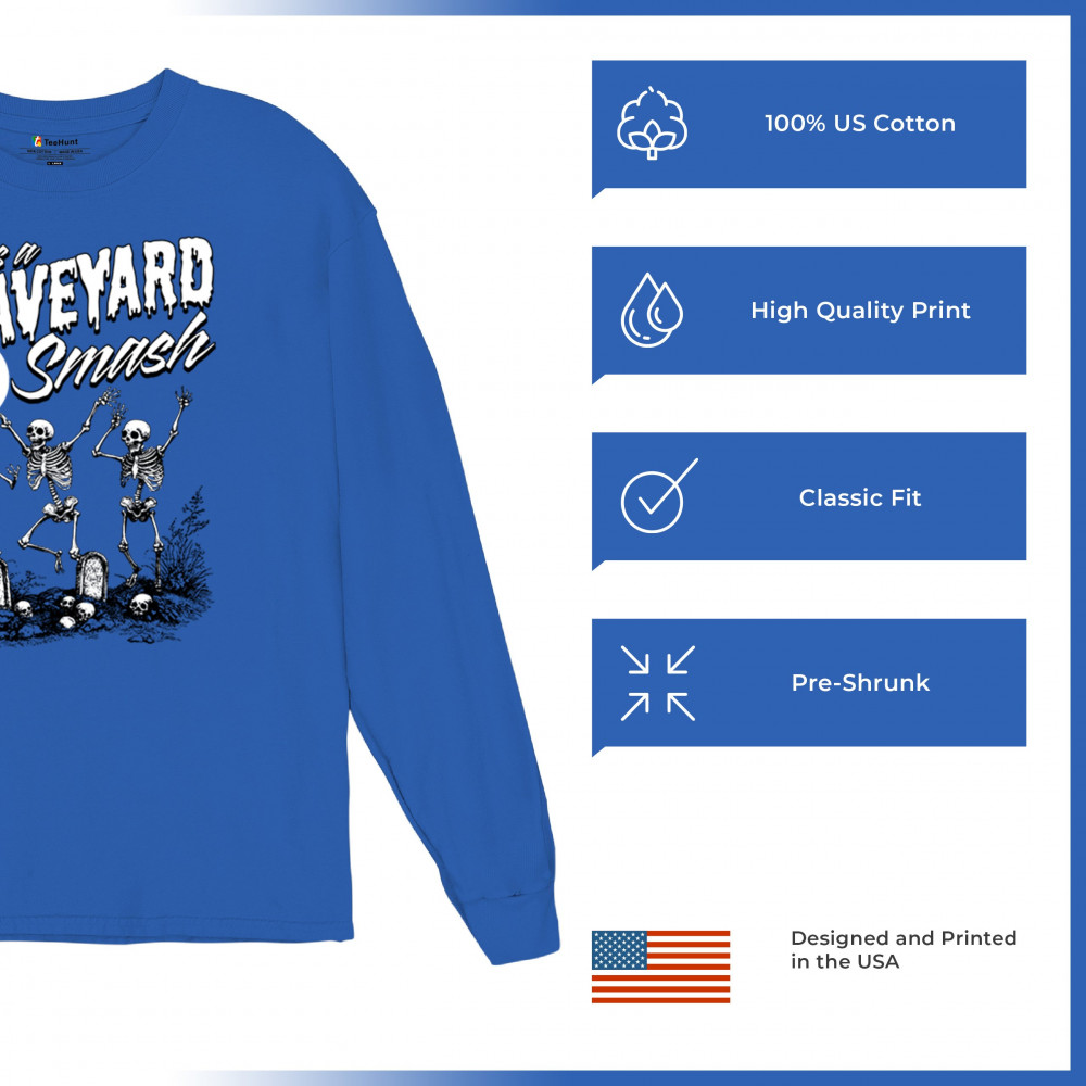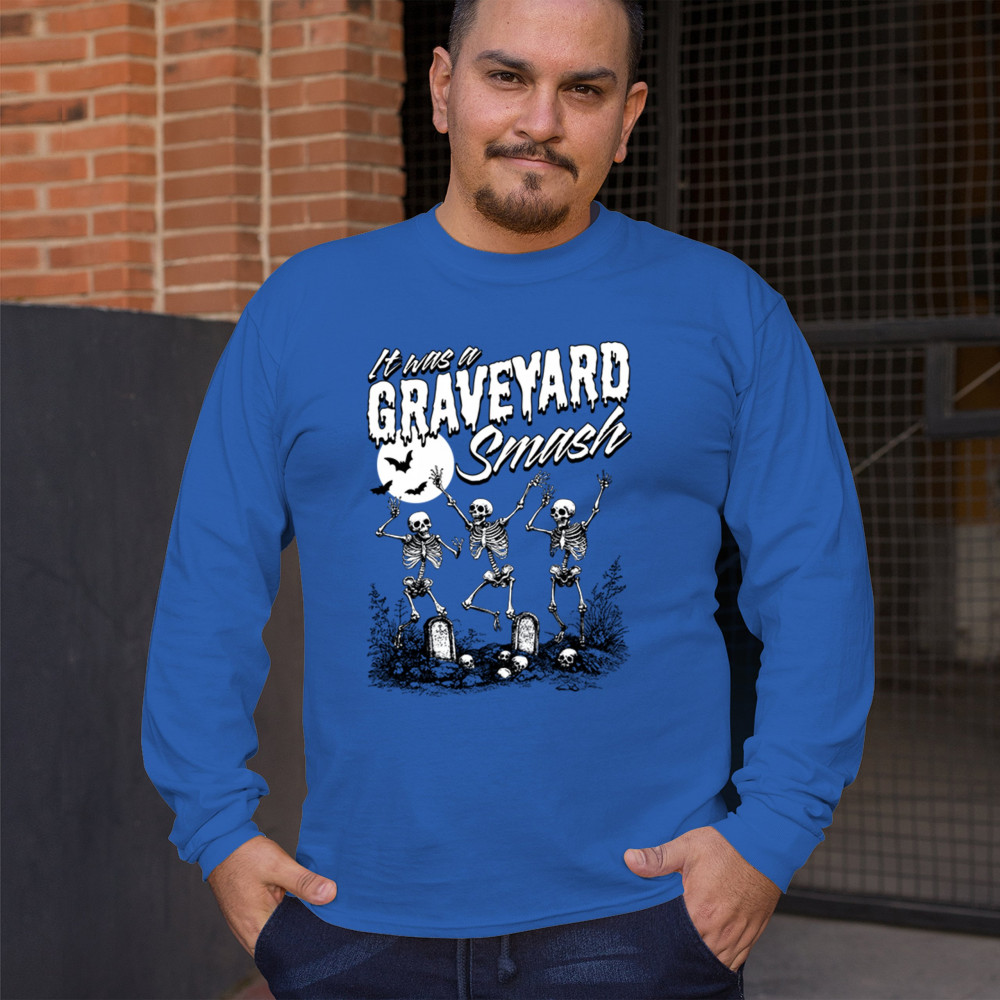 Add a touch of spooky fun to your Halloween attire with this "Graveyard Smash" design, showcasing skeletons dancing under the moonlight in a graveyard. Ideal for anyone who loves Halloween, this graphic tee is perfect for parties, haunted houses, or casual trick-or-treating. Made from high-quality materials, it offers both comfort and style, ensuring you look great while embracing the festive spirit. Available in multiple sizes, this shirt is a must-have for your Halloween collection.