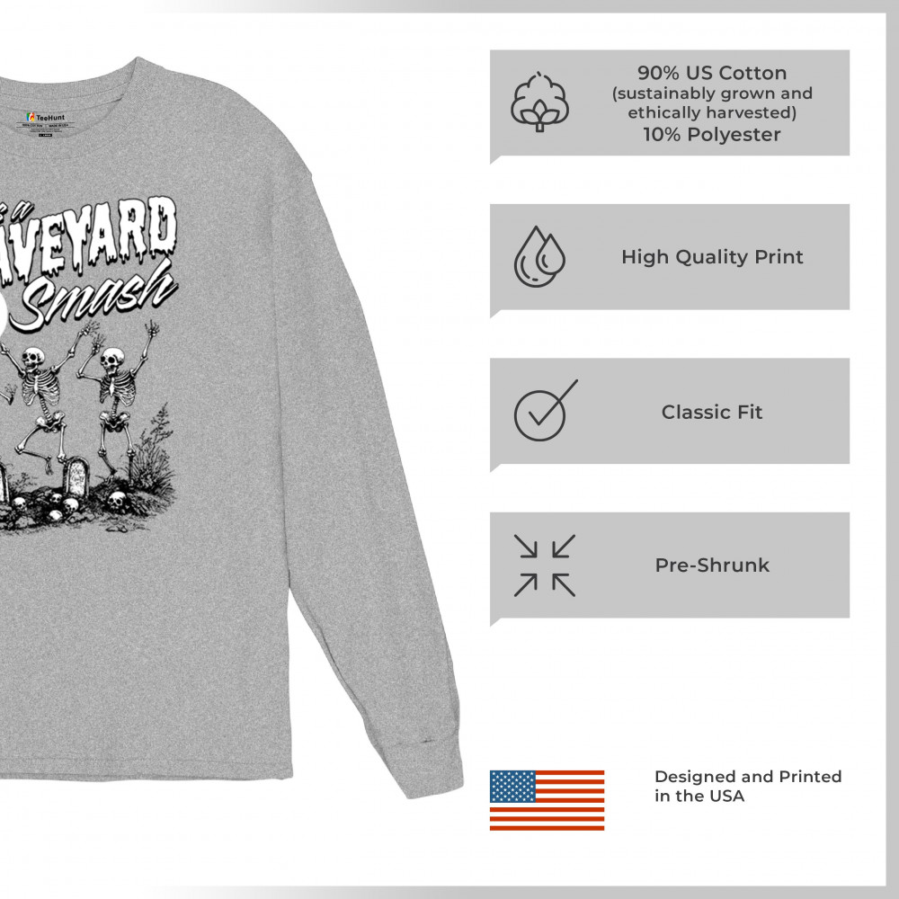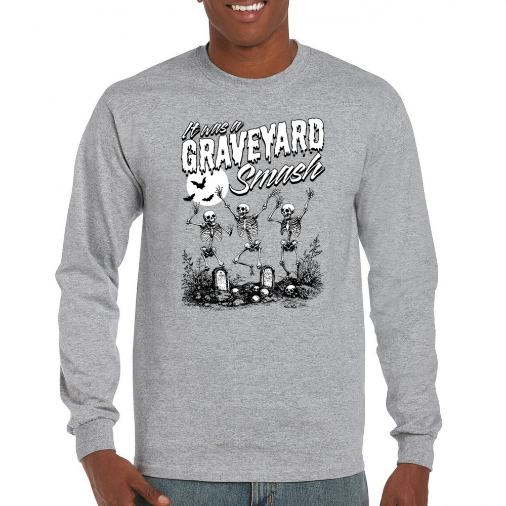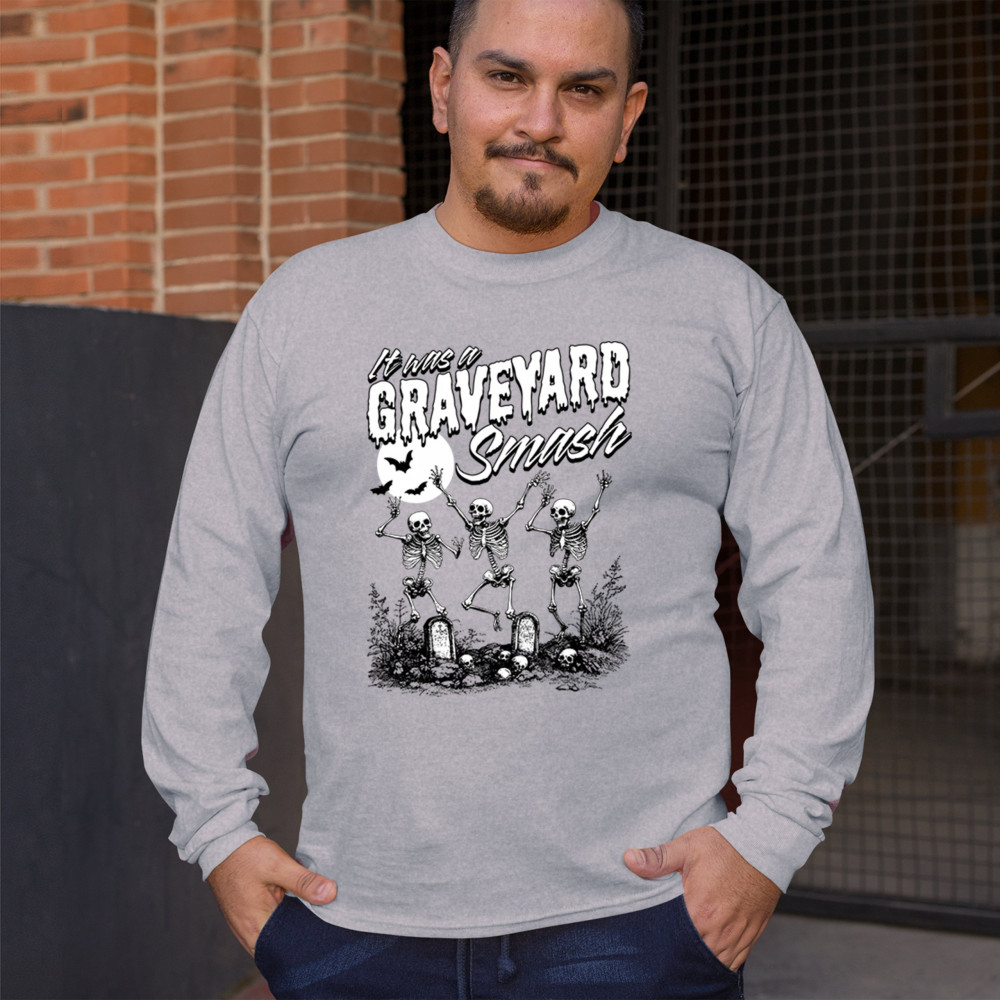 Add a touch of spooky fun to your Halloween attire with this "Graveyard Smash" design, showcasing skeletons dancing under the moonlight in a graveyard. Ideal for anyone who loves Halloween, this graphic tee is perfect for parties, haunted houses, or casual trick-or-treating. Made from high-quality materials, it offers both comfort and style, ensuring you look great while embracing the festive spirit. Available in multiple sizes, this shirt is a must-have for your Halloween collection.