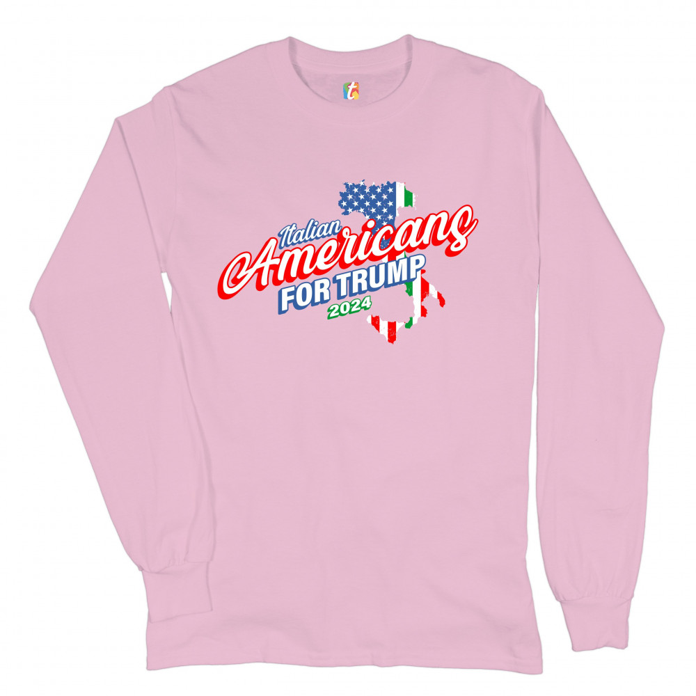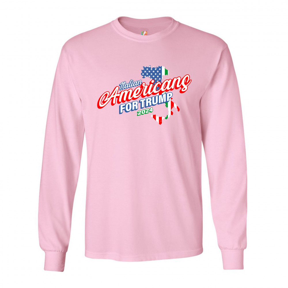 A political print saying "Italian Americans for Trump 2024". The print features a silhouette of Italy in the background with parts of the American and Italian flags inside of it. A great choice to wear for a Trump rally or give as a gift to a Donald Trump
