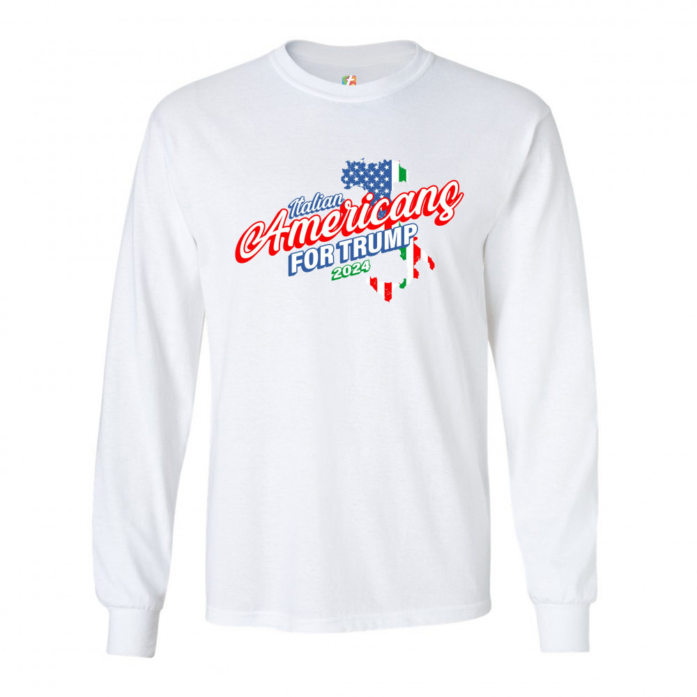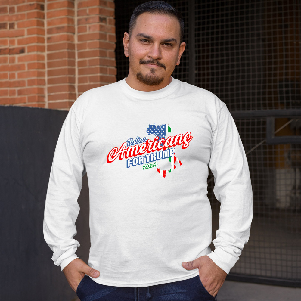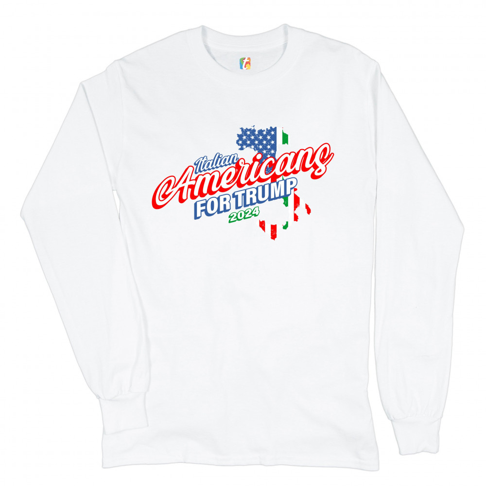 A political print saying "Italian Americans for Trump 2024". The print features a silhouette of Italy in the background with parts of the American and Italian flags inside of it. A great choice to wear for a Trump rally or give as a gift to a Donald Trump