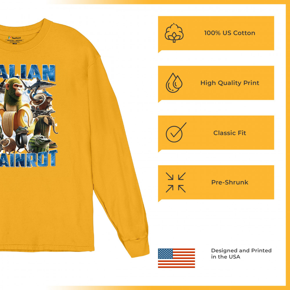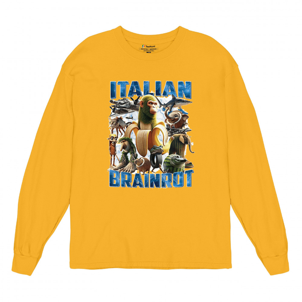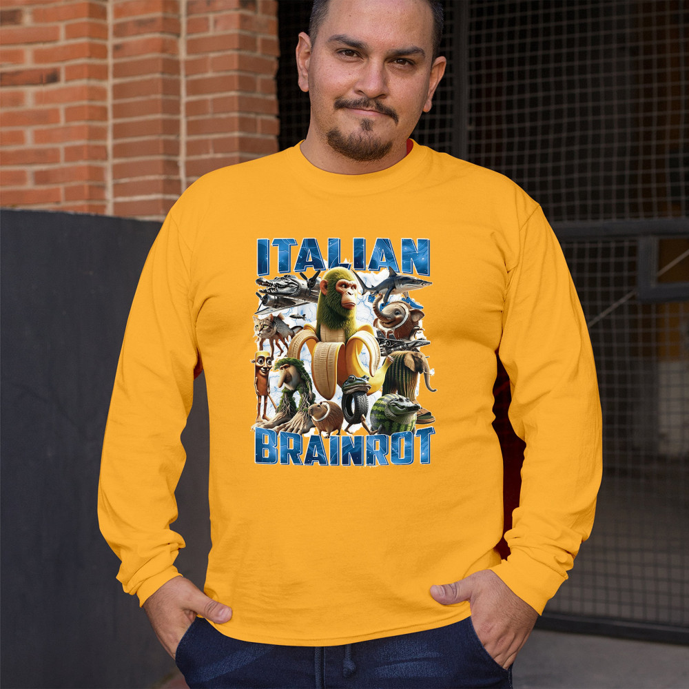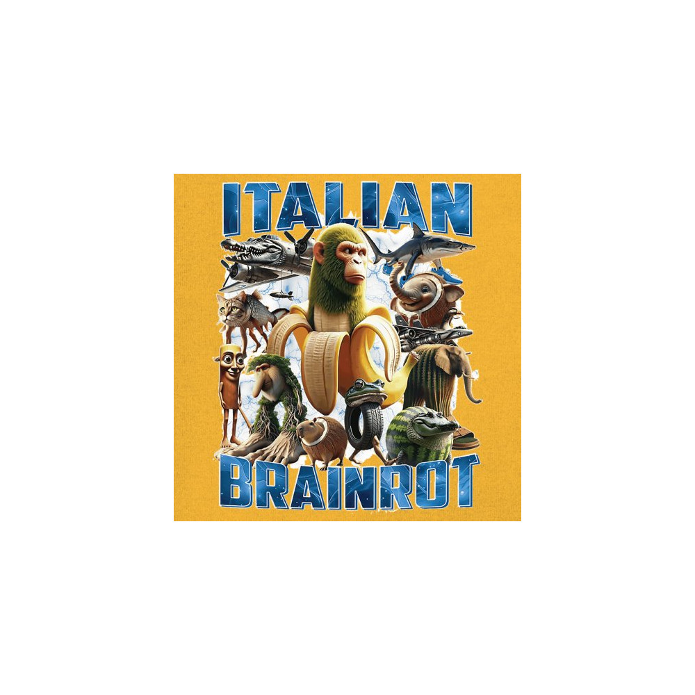 This design captures the full force of Italian brainrot—bananas, sharks, monkeys, and meme beasts collide in an unfiltered internet-core explosion. Perfect for fans of cursed humor, Gen Z trends, absurd fashion, TikTok memes, ironic style, surreal pop art, chaotic culture, digital nonsense, Gen Alpha brainrot, and hyper-online energy.