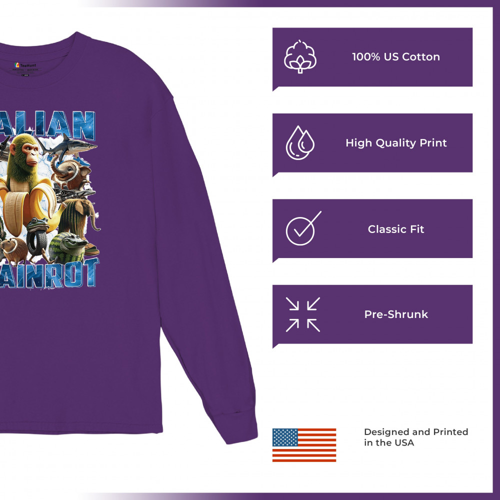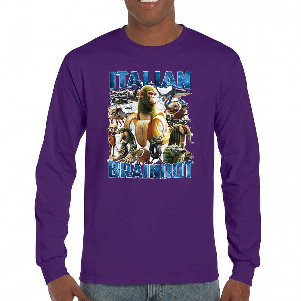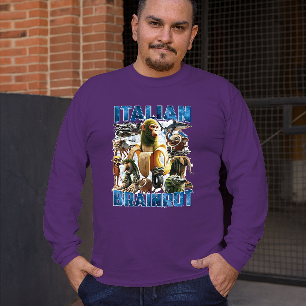This design captures the full force of Italian brainrot—bananas, sharks, monkeys, and meme beasts collide in an unfiltered internet-core explosion. Perfect for fans of cursed humor, Gen Z trends, absurd fashion, TikTok memes, ironic style, surreal pop art, chaotic culture, digital nonsense, Gen Alpha brainrot, and hyper-online energy.