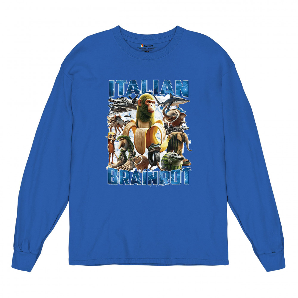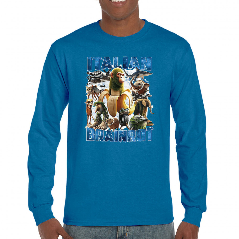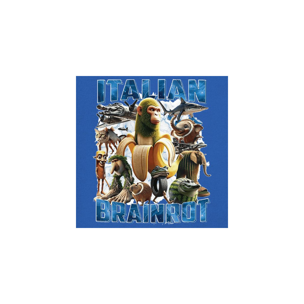 This design captures the full force of Italian brainrot—bananas, sharks, monkeys, and meme beasts collide in an unfiltered internet-core explosion. Perfect for fans of cursed humor, Gen Z trends, absurd fashion, TikTok memes, ironic style, surreal pop art, chaotic culture, digital nonsense, Gen Alpha brainrot, and hyper-online energy.